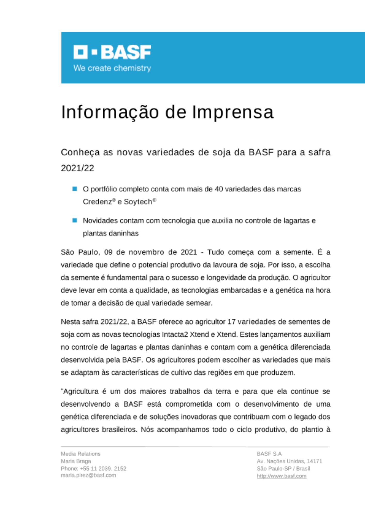 Nesta safra 2021/22, a BASF oferece ao agricultor 17 variedades de sementes de soja com as novas tecnologias Intacta2 Xtend e Xtend. Estes lançamentos auxiliam no controle de lagartas e plantas daninhas e contam com a genética diferenciada desenvolvida pela BASF. Os agricultores podem escolher as variedades que mais se adaptam às características de cultivo das regiões em que produzem.