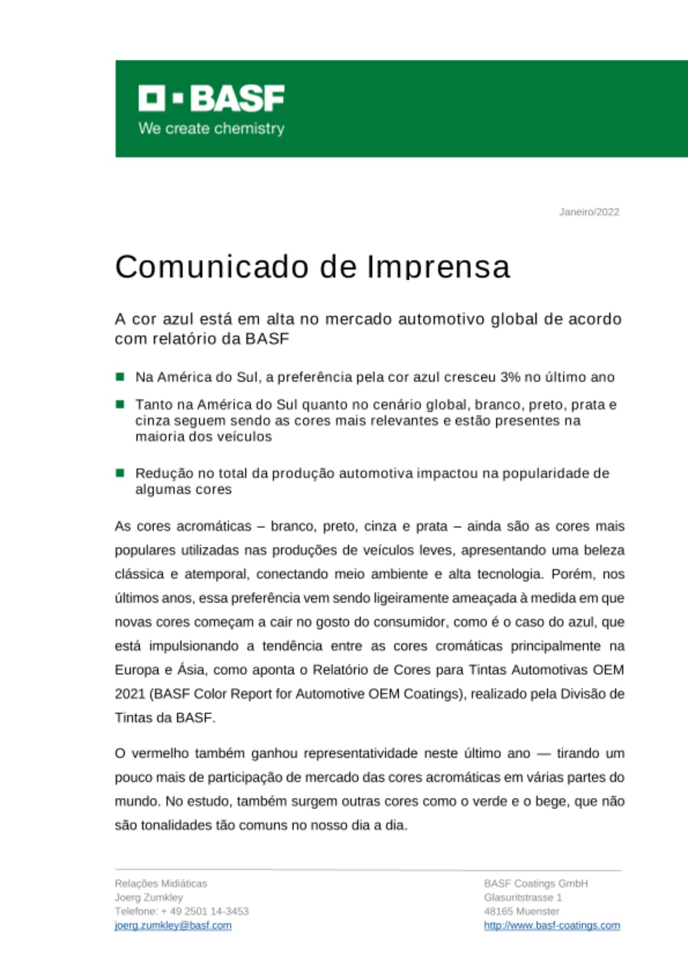 Os grandes desafios enfrentados pela indústria automotiva global no ano de 2021, com uma redução significante no número de veículos produzidos globalmente, ajudaram algumas cores a ganharem espaço frente a outras clássicas. Aqui na América do Sul, por exemplo, o percentual de carros na cor azul cresceu 3 pontos percentuais em 2021, impulsionado por novos lançamentos utilizando esta cor.