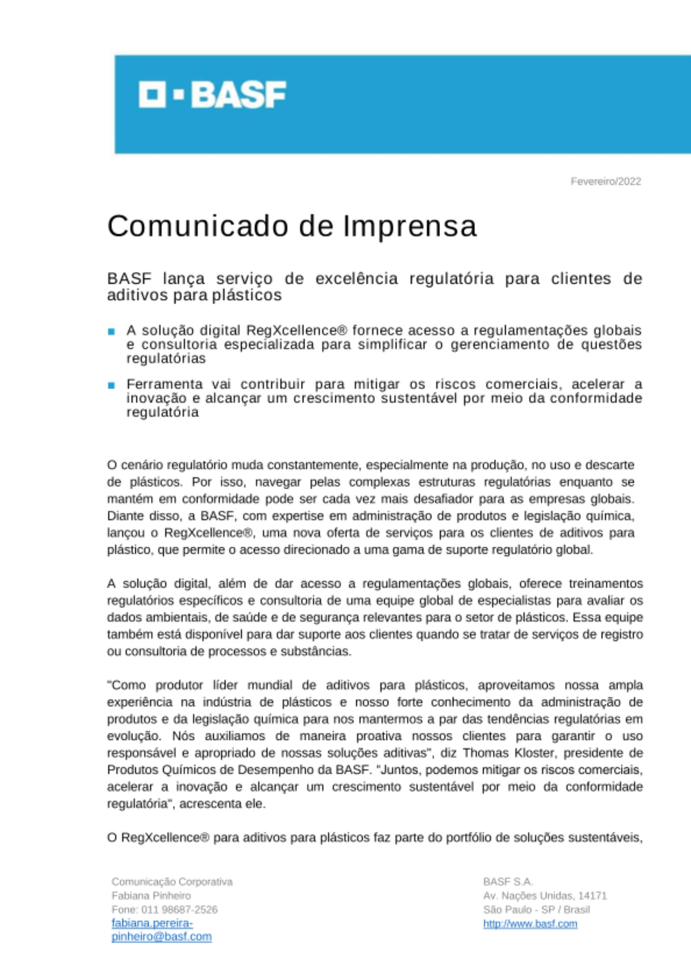 O cenário regulatório muda constantemente, especialmente na produção, no uso e descarte de plásticos. Por isso, navegar pelas complexas estruturas regulatórias enquanto se mantém em conformidade pode ser cada vez mais desafiador para as empresas globais. Diante disso, a BASF, com expertise em administração de produtos e legislação química, lançou o RegXcellence®, uma nova oferta de serviços para os clientes de aditivos para plástico, que permite o acesso direcionado a uma gama de suporte regulatório global.