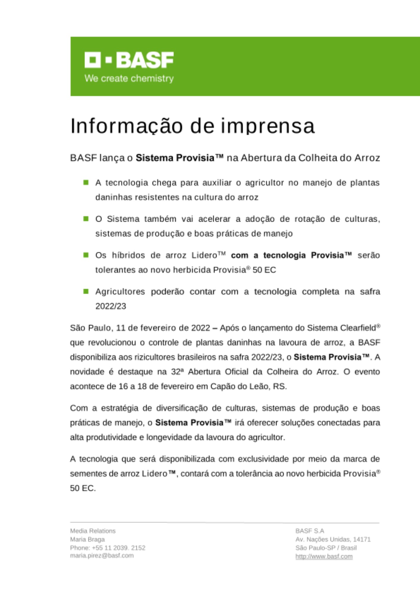 São Paulo, 01 de fevereiro de 2022 – Após o lançamento do Sistema Clearfield® que revolucionou o controle de plantas daninhas na lavoura de arroz, a BASF disponibiliza aos rizicultores brasileiros na safra 2022/23, o Sistema Provisia™.