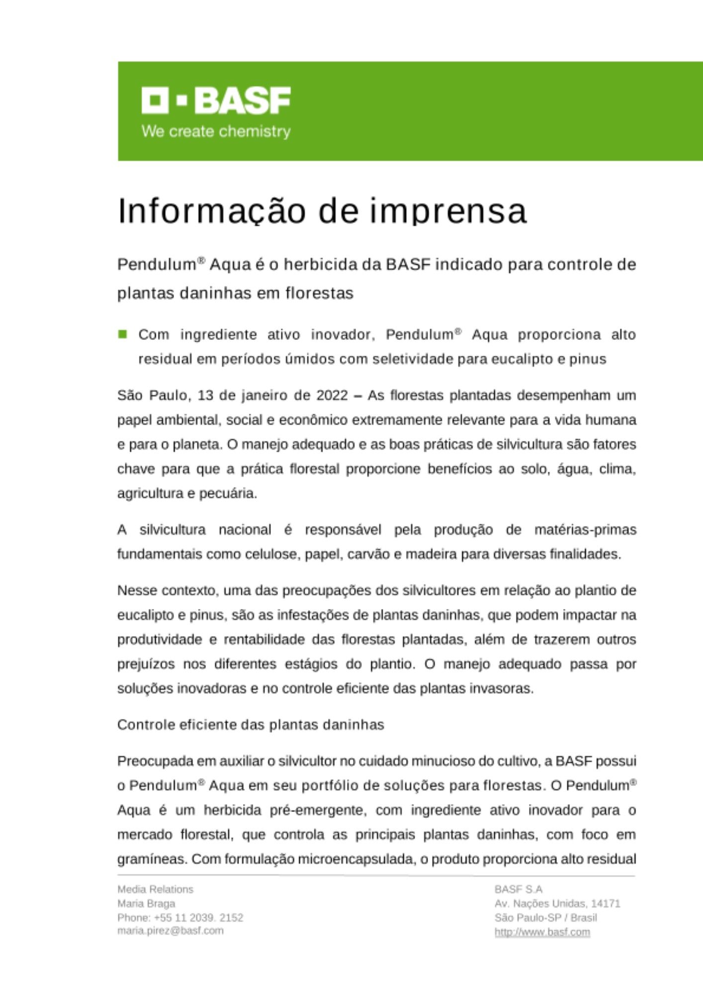 Preocupada em auxiliar o silvicultor no cuidado minucioso do cultivo, a BASF possui o Pendulum® Aqua em seu portfólio de soluções para florestas. O Pendulum® Aqua é um herbicida pré-emergente, com ingrediente ativo inovador para o mercado florestal, que controla as principais plantas daninhas, com foco em gramíneas. Com formulação microencapsulada, o produto proporciona alto residual em períodos úmidos com seletividade para eucalipto e pinus.