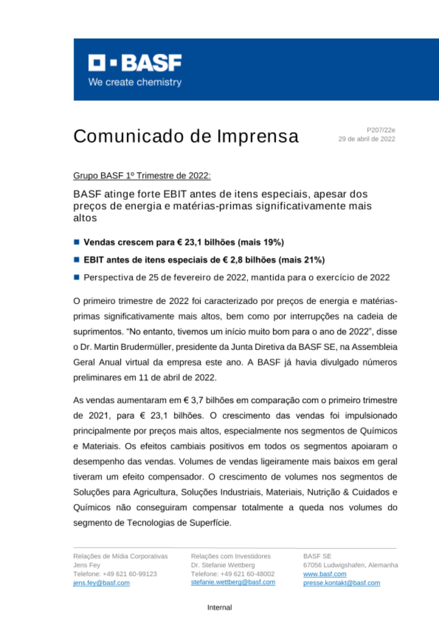 O primeiro trimestre de 2022 foi caracterizado por preços de energia e matérias-primas significativamente mais altos, bem como por interrupções na cadeia de suprimentos. “No entanto, tivemos um início muito bom para o ano de 2022”, disse o Dr. Martin Brudermüller, presidente da Junta Diretiva da BASF SE, na Assembleia Geral Anual virtual da empresa este ano. A BASF já havia divulgado números preliminares em 11 de abril de 2022.
