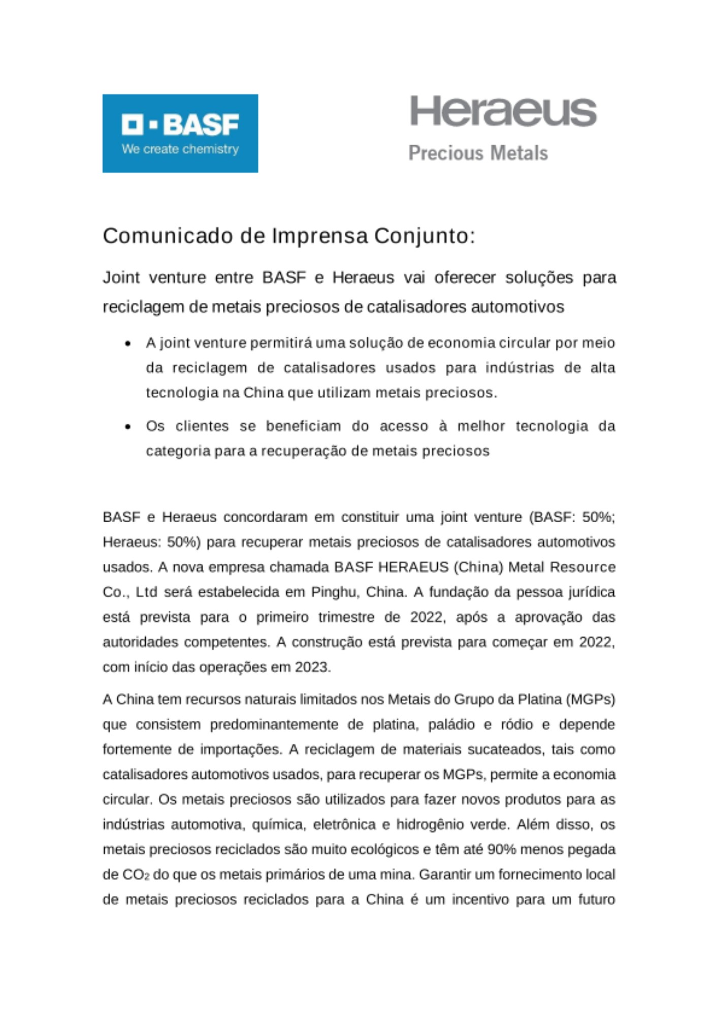 BASF e Heraeus concordaram em constituir uma joint venture (BASF: 50%; Heraeus: 50%) para recuperar metais preciosos de catalisadores automotivos usados. A nova empresa chamada BASF HERAEUS (China) Metal Resource Co., Ltd será estabelecida em Pinghu, China. A fundação da pessoa jurídica está prevista para o primeiro trimestre de 2022, após a aprovação das autoridades competentes. A construção está prevista para começar em 2022, com início das operações em 2023.