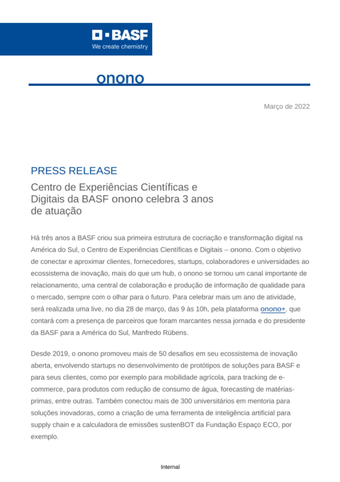 Desde 2019, o onono promoveu mais de 50 desafios em seu ecossistema de inovação aberta, envolvendo startups no desenvolvimento de protótipos de soluções para BASF e para seus clientes, como por exemplo para mobilidade agrícola, para tracking de e-commerce, para produtos com redução de consumo de água, forecasting de matérias-primas, entre outras. Também conectou mais de 300 universitários em mentoria para soluções inovadoras, como a criação de uma ferramenta de inteligência artificial para supply chain e a calculadora de emissões sustenBOT da Fundação Espaço ECO, por exemplo.