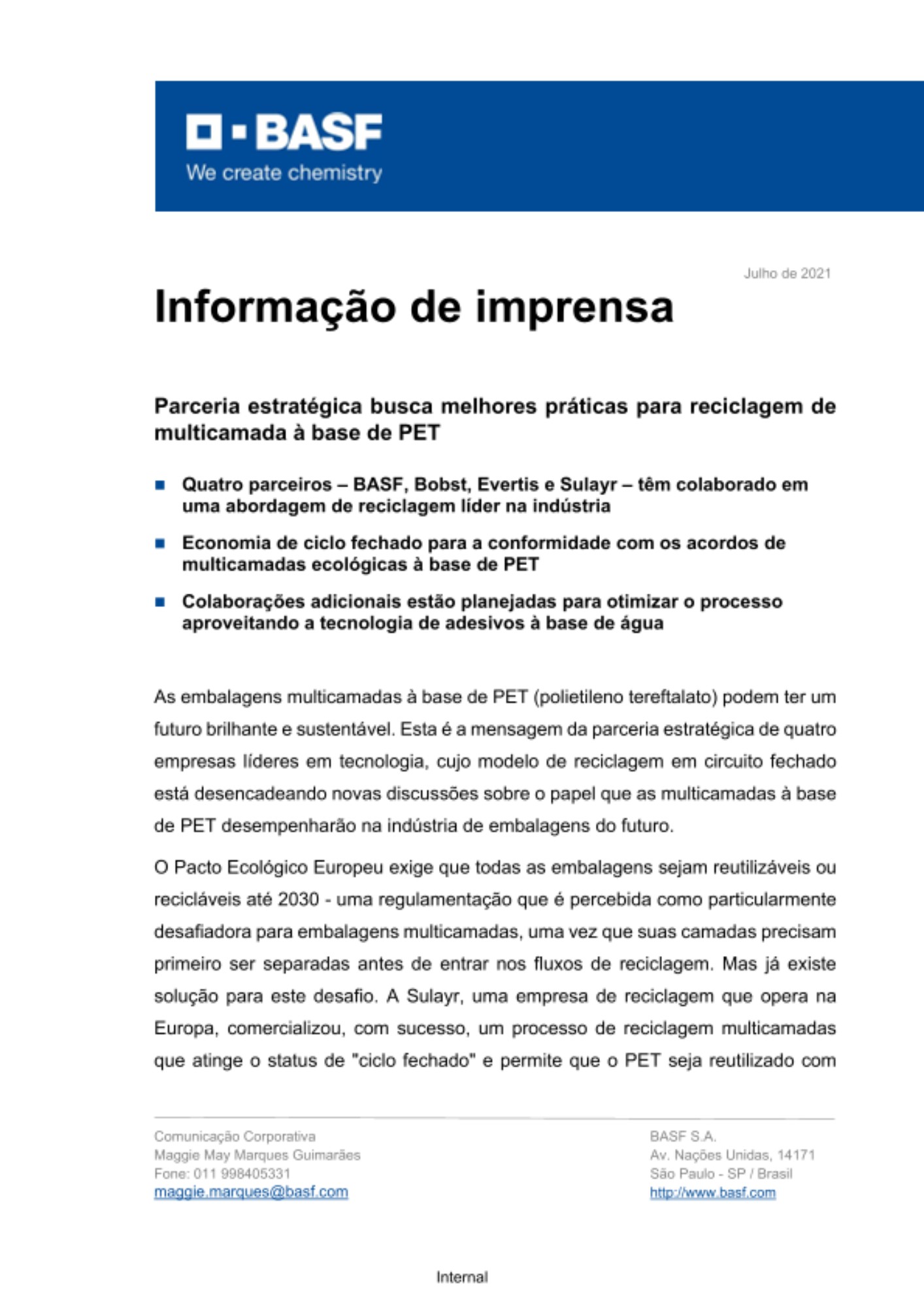 - Quatro parceiros - BASF, Bobst, Evertis e Sulayr - têm colaborado em uma abordagem de reciclagem líder na indústria