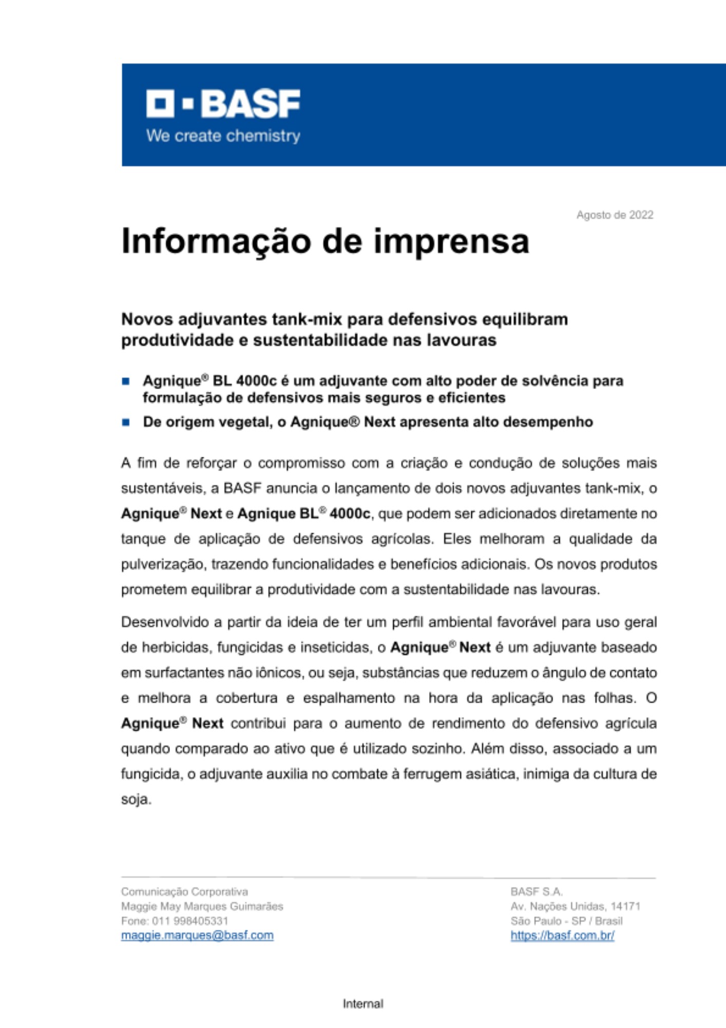 A fim de reforçar o compromisso com a criação e condução de soluções mais sustentáveis, a BASF anuncia o lançamento de dois novos adjuvantes tank-mix, o Agnique®Next e Agnique BL® 4000c, que podem ser adicionados diretamente no tanque de aplicação de defensivos agrícolas. Eles melhoram a qualidade da pulverização, trazendo funcionalidades e benefícios adicionais. Os novos produtos prometem equilibrar a produtividade com a sustentabilidade nas lavouras.