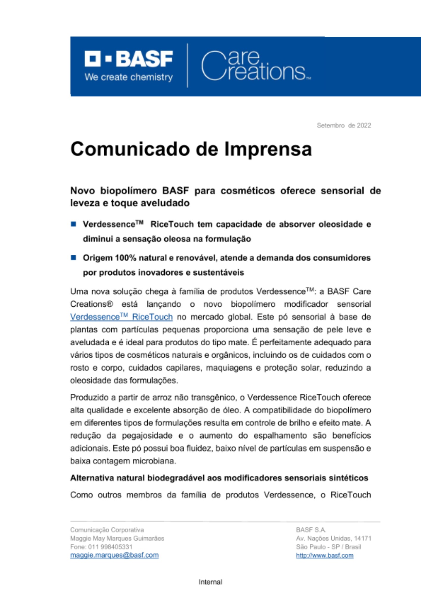 Uma nova solução chega à família de produtos VerdessenceTM: a BASF Care Creations® está lançando o novo biopolímero modificador sensorial VerdessenceTM RiceTouch no mercado global. Este pó sensorial à base de plantas com partículas pequenas proporciona uma sensação de pele leve e aveludada e é ideal para produtos do tipo mate. É perfeitamente adequado para vários tipos de cosméticos naturais e orgânicos, incluindo os de cuidados com o rosto e corpo, cuidados capilares, maquiagens e proteção solar, reduzindo a oleosidade das formulações.