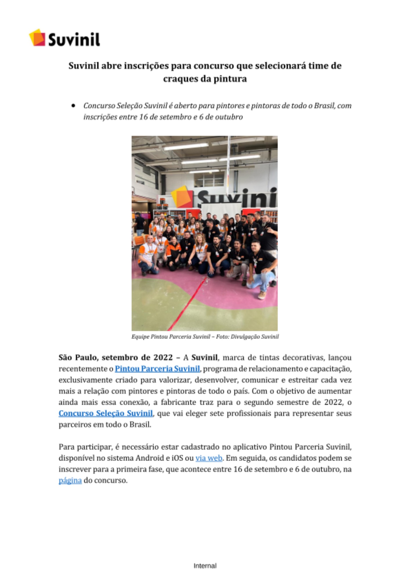 A Suvinil, marca de tintas decorativas, lançou recentemente o Pintou Parceria Suvinil, programa de relacionamento e capacitação, exclusivamente criado para valorizar, desenvolver, comunicar e estreitar cada vez mais a relação com pintores e pintoras de todo o país. Com o objetivo de aumentar ainda mais essa conexão, a fabricante traz para o segundo semestre de 2022, o Concurso Seleção Suvinil, que vai eleger sete profissionais para representar seus parceiros em todo o Brasil.