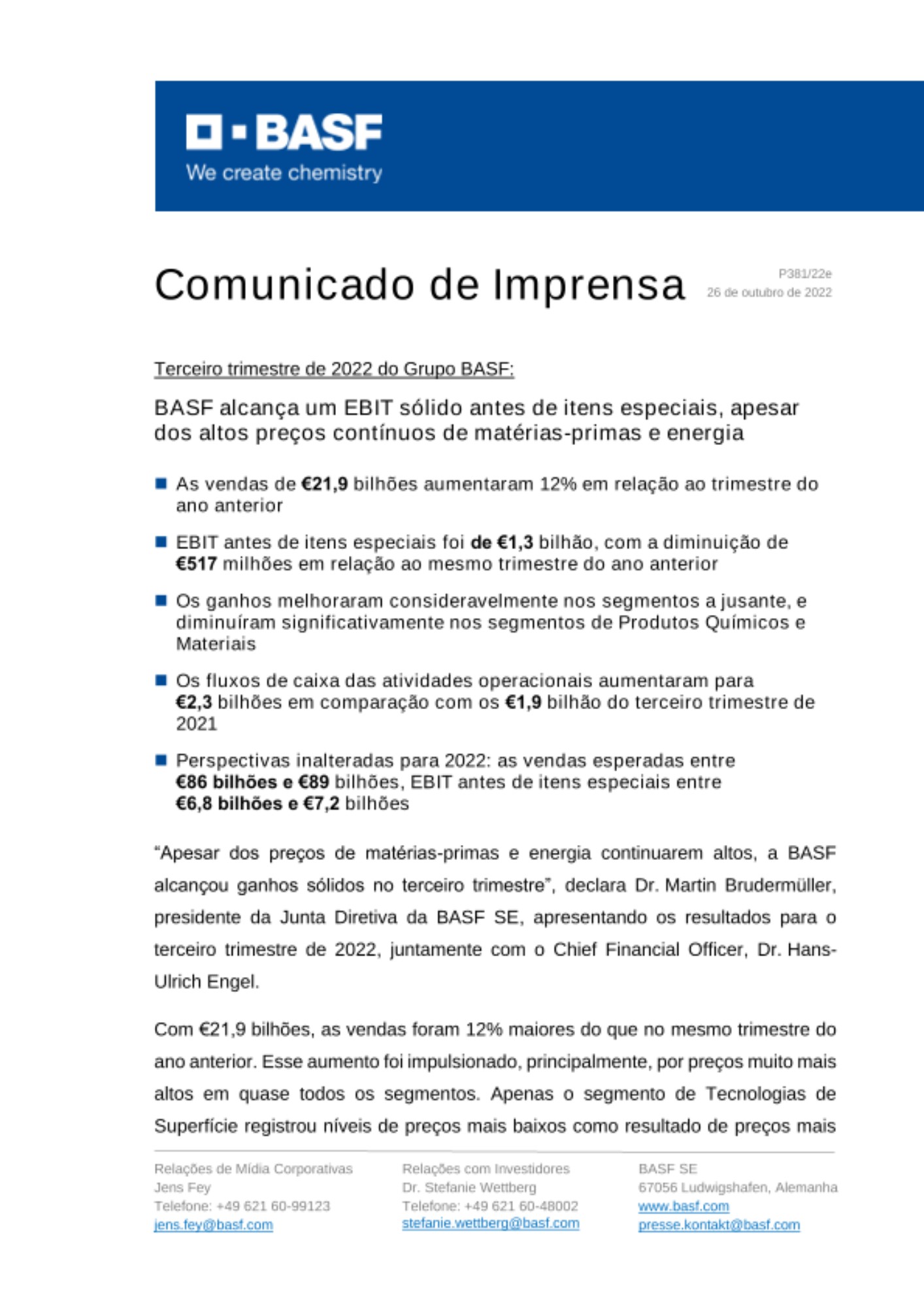 Apesar do enfraquecimento significativo do ambiente econômico desde o terceiro trimestre de 2022, a previsão do Grupo BASF para o exercício de 2022 publicada no Relatório Financeiro Semestral de 2022 permanece inalterada: