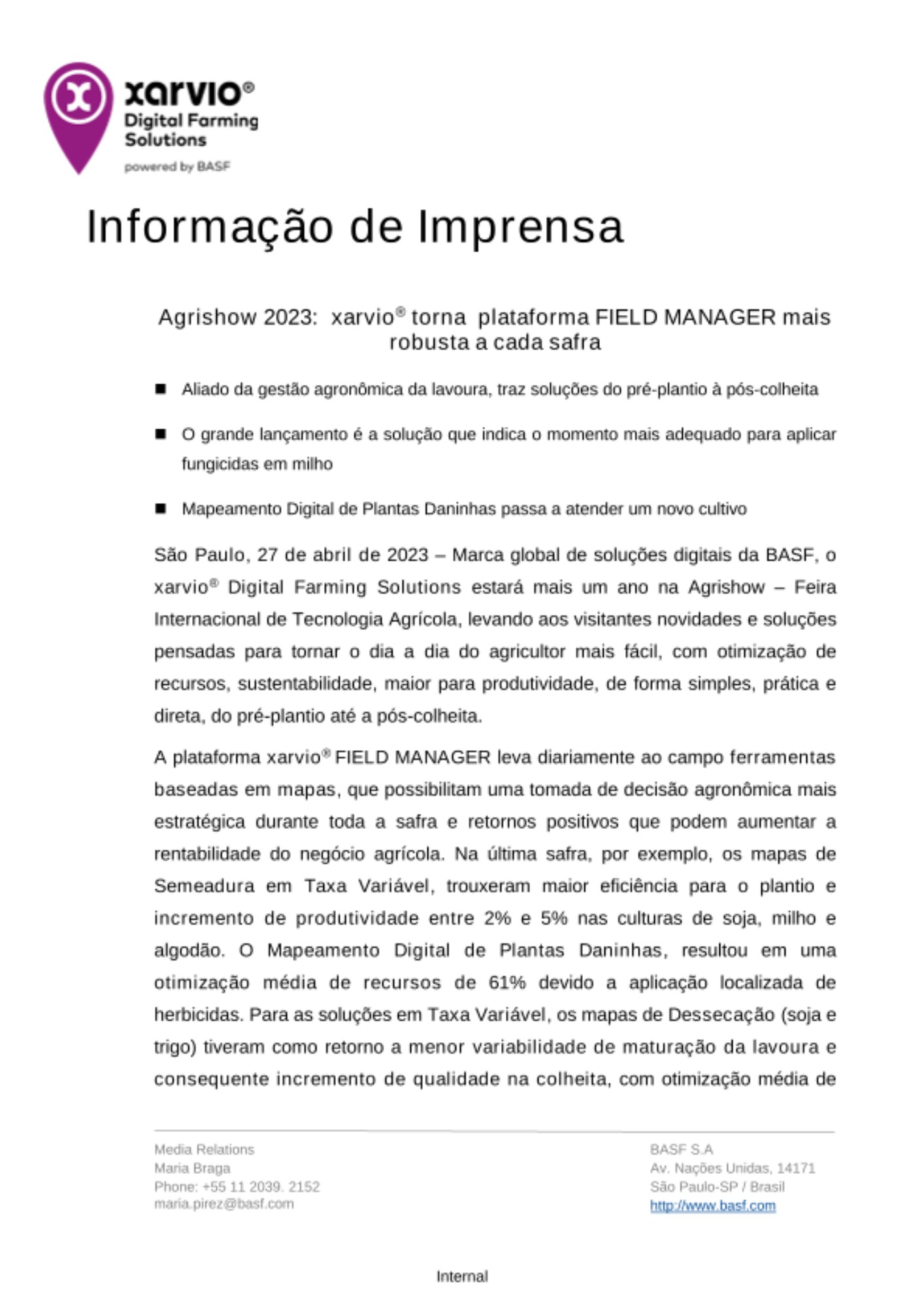 A BASF Digital Farming está na vanguarda da transformação digital da agricultura, otimizando a produção agrícola. É a marca xarvio® Digital Farming Solutions que oferece produtos digitais baseados em uma plataforma líder de modelagem de cultivos, que oferece consultoria agronômica independente e específica para a zona do campo, possibilitando que os agricultores produzam de maneira mais eficiente e sustentável. Os produtos xarvio® SCOUTING, FIELD MANAGER e HEALTHY FIELDS estão sendo usados por agricultores em mais de 100 países. O xarvio® FIELD MANAGER é usado por 100.000 agricultores (área total de mais de 16 milhões de ha) em 14 países, e o xarvio SCOUTING é usado por mais de 7 milhões de agricultores e consultores. Para obter mais informações, visite www.xarvio.com/br ou qualquer um de nossos canais de mídia social: YouTube, Facebook, Instagram e LinkedIn.