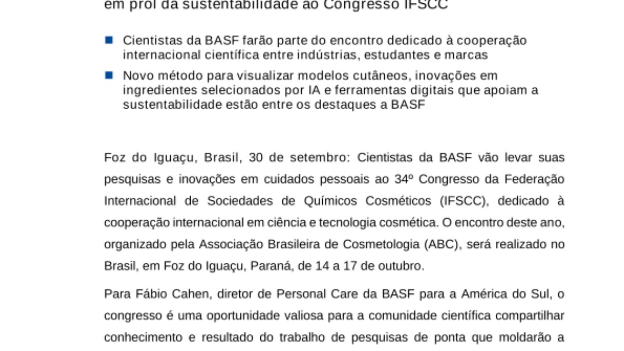 Para Fábio Cahen, diretor de Personal Care da BASF para a América do Sul, o congresso é uma oportunidade valiosa para a comunidade científica compartilhar conhecimento e resultado do trabalho de pesquisas de ponta que moldarão a cosmetologia nos próximos anos. “Será um momento especial para receber no Brasil cientistas de todo o mundo e mostrar, além das inovações da BASF que estão alinhadas às tendências e demandas do mercado global, a jornada de sustentabilidade dos nossos processos produtivos no Brasil”, afirma.