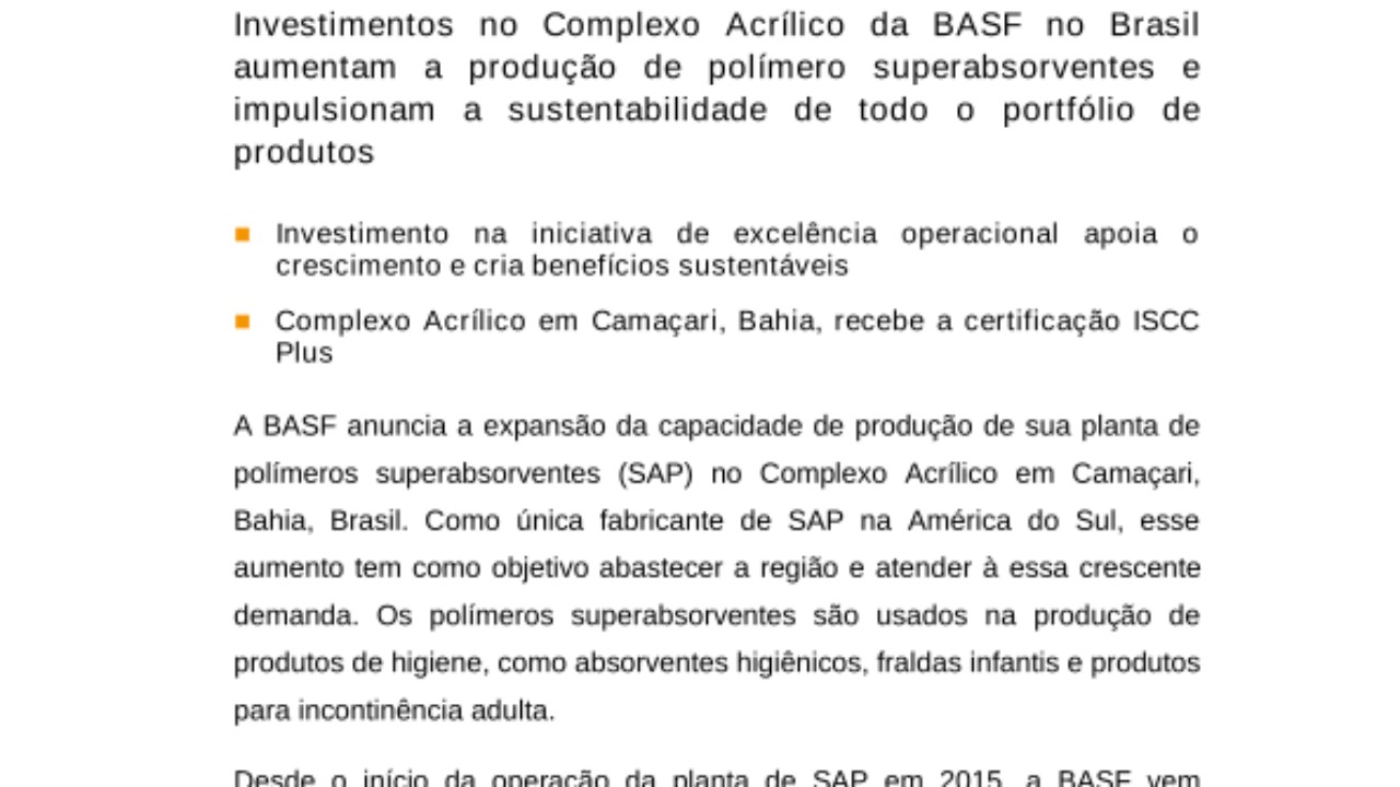A BASF anuncia a expansão da capacidade de produção de sua planta de polímeros superabsorventes (SAP) no Complexo Acrílico em Camaçari, Bahia, Brasil. Como única fabricante de SAP na América do Sul, esse aumento tem como objetivo abastecer a região e atender à essa crescente demanda. Os polímeros superabsorventes são usados na produção de produtos de higiene, como absorventes higiênicos, fraldas infantis e produtos para incontinência adulta.