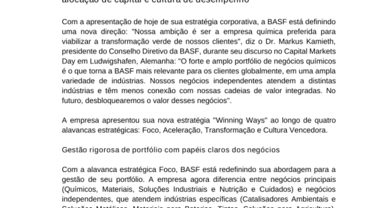 Com a apresentação de hoje de sua estratégia corporativa, a BASF está definindo uma nova direção: "Nossa ambição é ser a empresa química preferida para viabilizar a transformação verde de nossos clientes", diz o Dr. Markus Kamieth, presidente do Conselho Diretivo da BASF, durante seu discurso no Capital Markets Day em Ludwigshafen, Alemanha: "O forte e amplo portfólio de negócios químicos é o que torna a BASF mais relevante para os clientes globalmente, em uma ampla variedade de indústrias. Nossos negócios independentes atendem a distintas indústrias e têm menos conexão com nossas cadeias de valor integradas. No futuro, desbloquearemos o valor desses negócios".