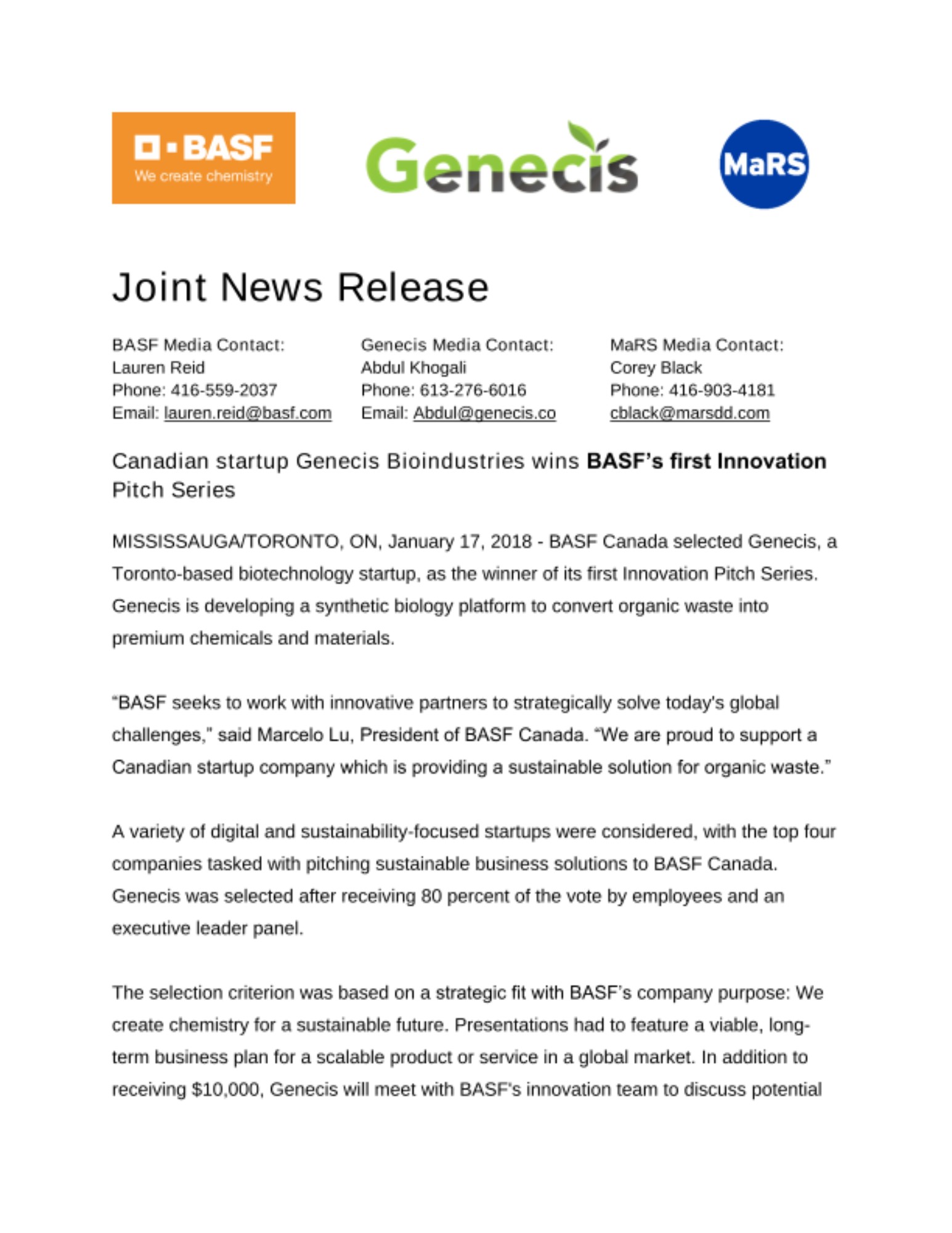 MISSISSAUGA/TORONTO, ON, January 17, 2018 - BASF Canada selected Genecis, a Toronto-based biotechnology startup, as the winner of its first Innovation Pitch Series. Genecis is developing a synthetic biology platform to convert organic waste into premium chemicals and materials.