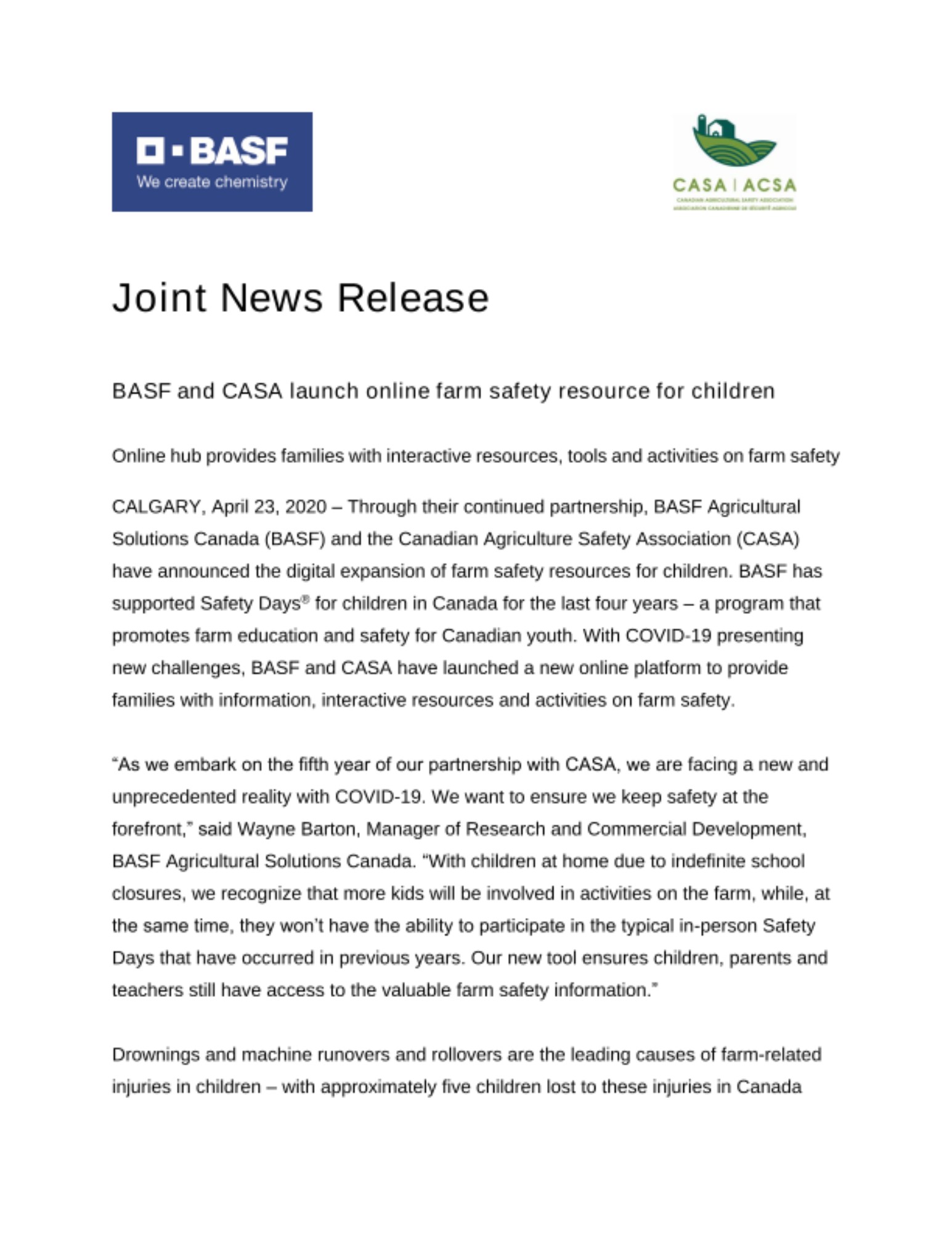 CALGARY, April 23, 2020 – Through their continued partnership, BASF Agricultural Solutions Canada (BASF) and the Canadian Agriculture Safety Association (CASA) have announced the digital expansion of farm safety resources for children. BASF has supported Safety Days® for children in Canada for the last four years – a program that promotes farm education and safety for Canadian youth. With COVID-19 presenting new challenges, BASF and CASA have launched a new online platform to provide families with information, interactive resources and activities on farm safety.