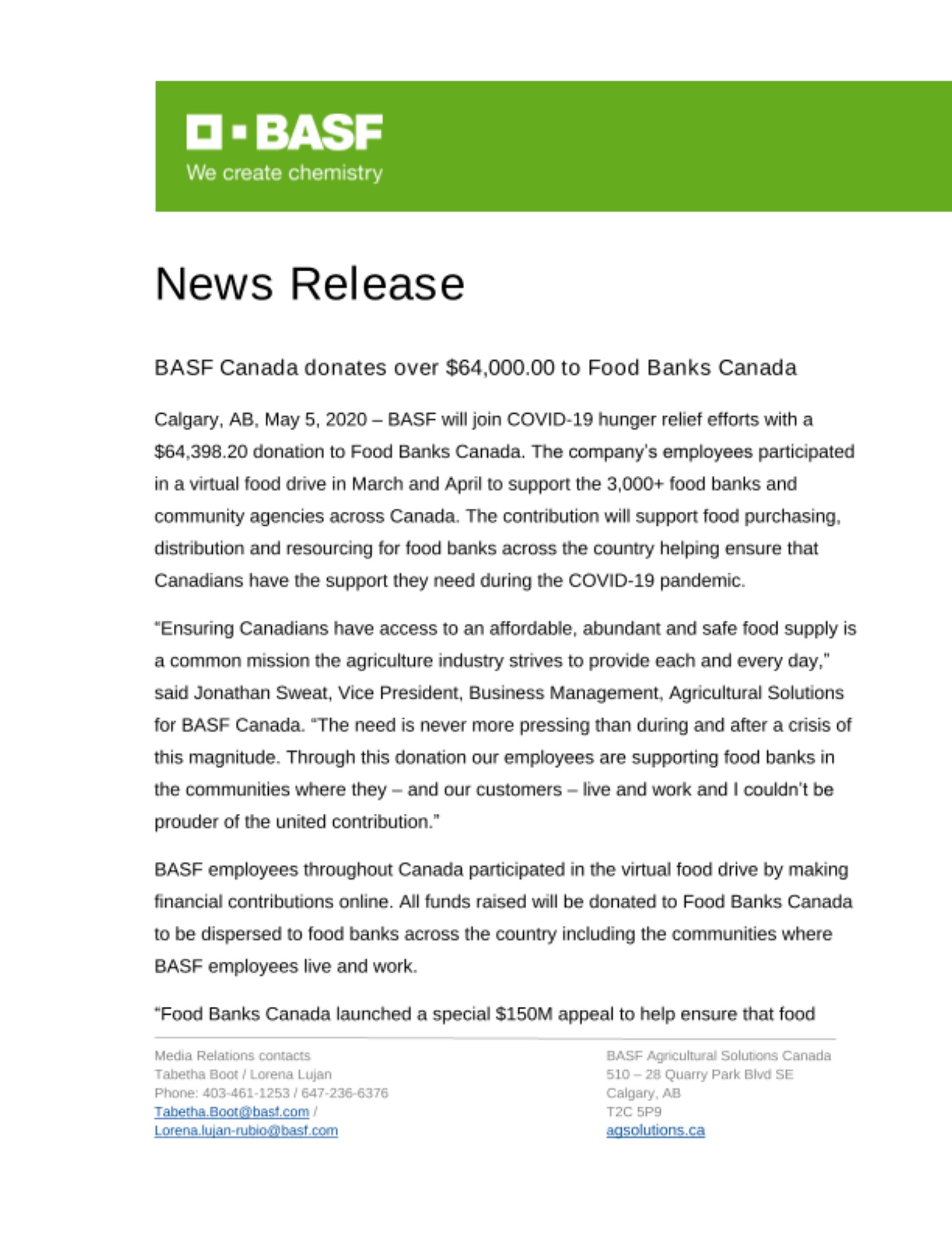 Calgary, AB, May 5, 2020 – BASF will join COVID-19 hunger relief efforts with a $64,398.20 donation to Food Banks Canada. The company’s employees participated in a virtual food drive in March and April to support the 3,000+ food banks and community agencies across Canada. The contribution will support food purchasing, distribution and resourcing for food banks across the country helping ensure that Canadians have the support they need during the COVID-19 pandemic.