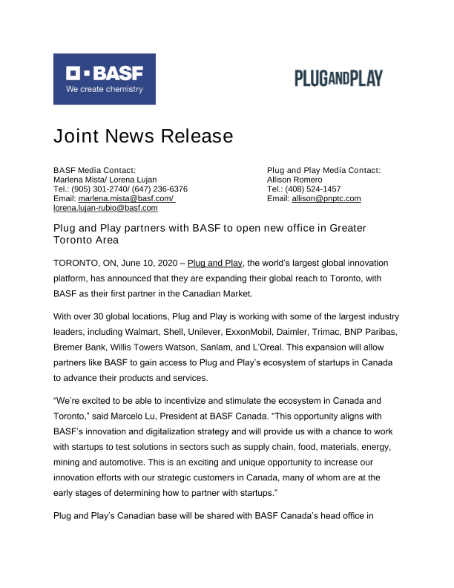 “Plug and Play looks forward to fully participating in the amazing tech ecosystem in Canada and being able to connect corporations to startups and their innovations,” said Farzin Shadpour, Vice President of Plug and Play. “We’re looking forward to creating a presence in Toronto and work with corporations like BASF, who through its many sectors of focus, brings a diverse perspective to our innovation ecosystem for both startups and other partners.”