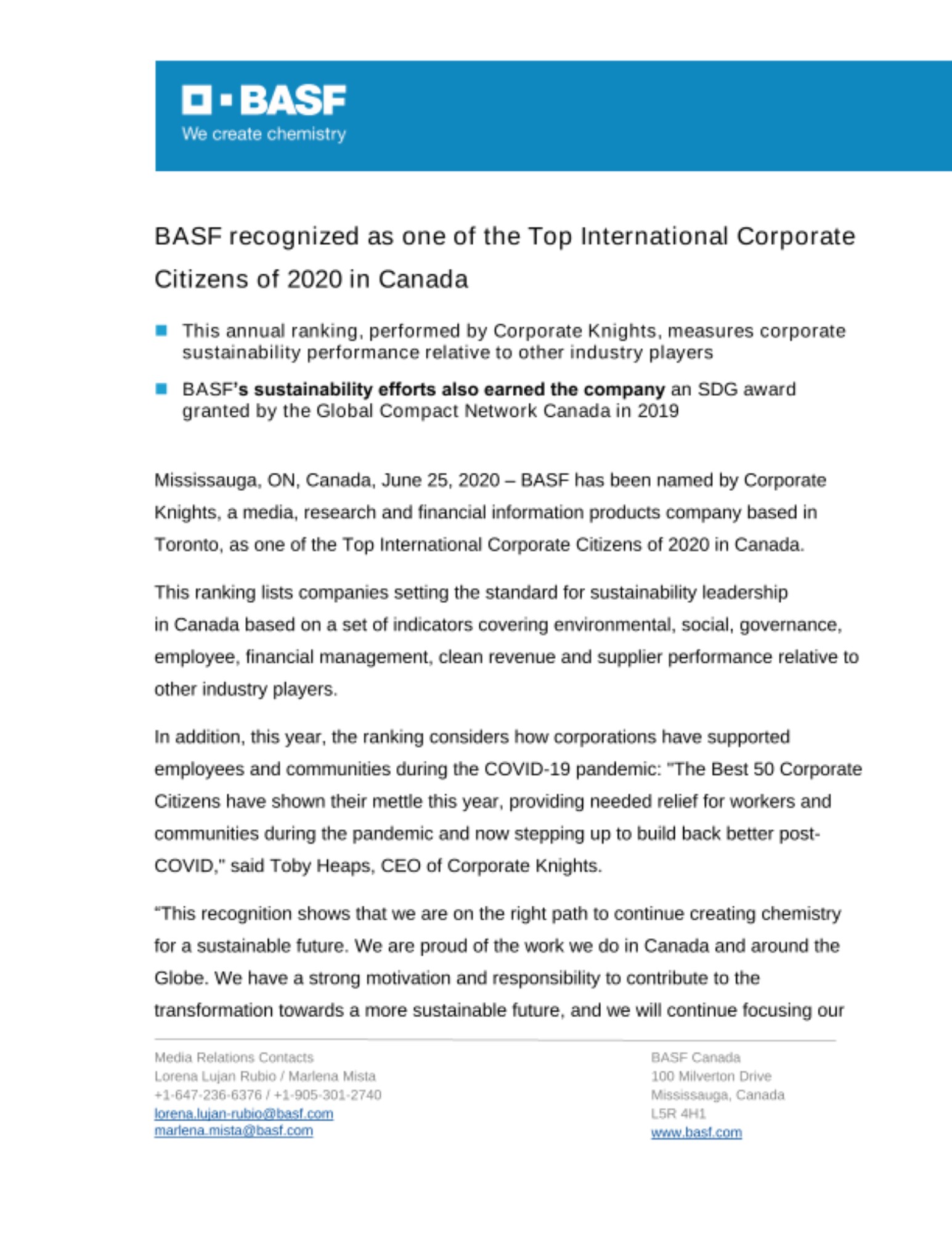 Mississauga, ON, Canada, June 25, 2020 – BASF has been named by Corporate Knights, a media, research and financial information products company based in Toronto, as one of the Top International Corporate Citizens of 2020 in Canada.