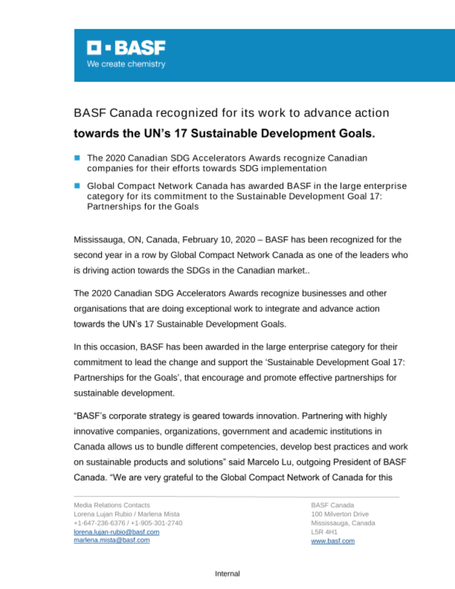 Mississauga, ON, Canada, February 10, 2020 – BASF has been recognized for the second year in a row by Global Compact Network Canada as one of the leaders who is driving action towards the SDGs in the Canadian market..