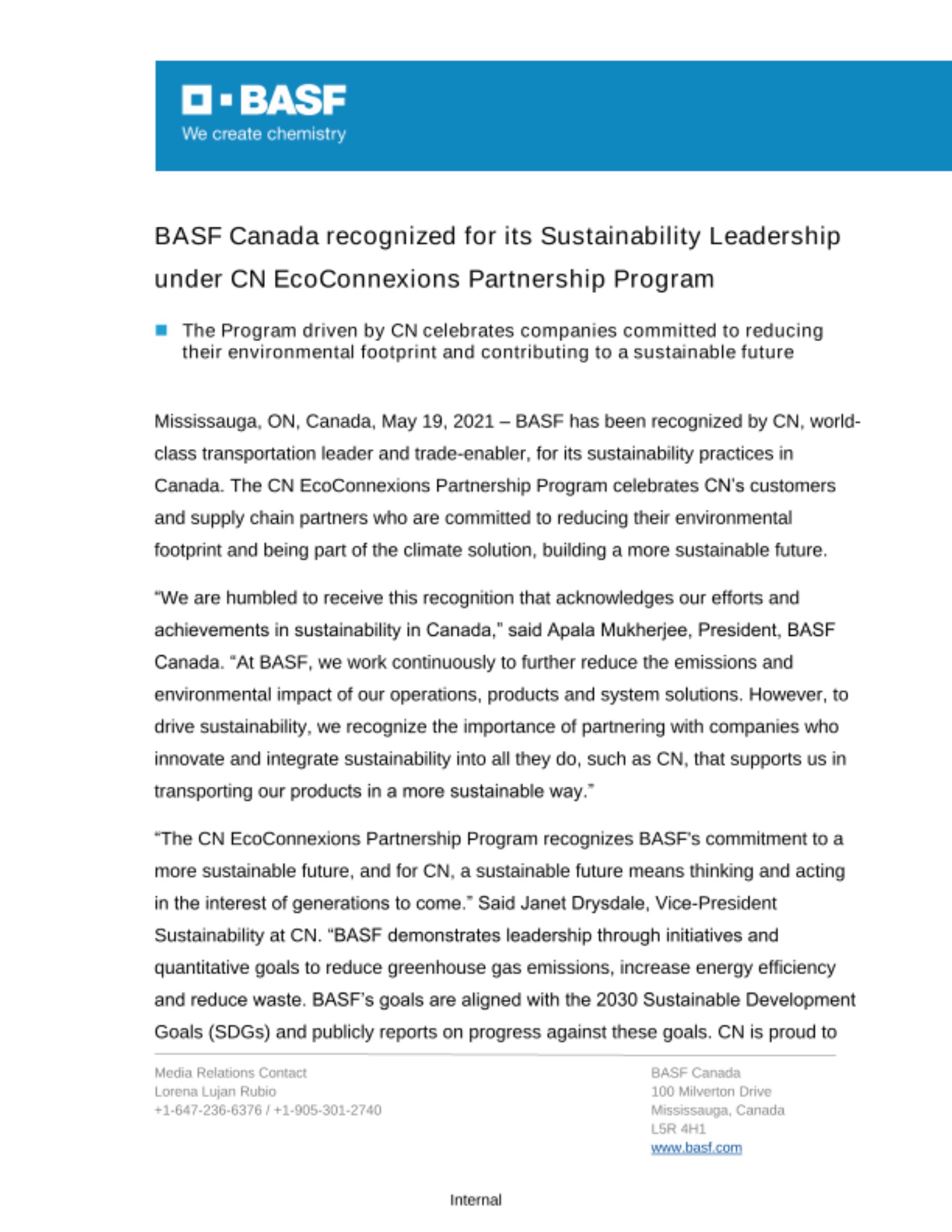 “The CN EcoConnexions Partnership Program recognizes BASF's commitment to a more sustainable future, and for CN, a sustainable future means thinking and acting in the interest of generations to come.” Said Janet Drysdale, Vice-President Sustainability at CN. “BASF demonstrates leadership through initiatives and quantitative goals to reduce greenhouse gas emissions, increase energy efficiency and reduce waste. BASF’s goals are aligned with the 2030 Sustainable Development Goals (SDGs) and publicly reports on progress against these goals. CN is proud to recognize BASF's leadership in sustainability through its EcoConnections Partnership Program.”
