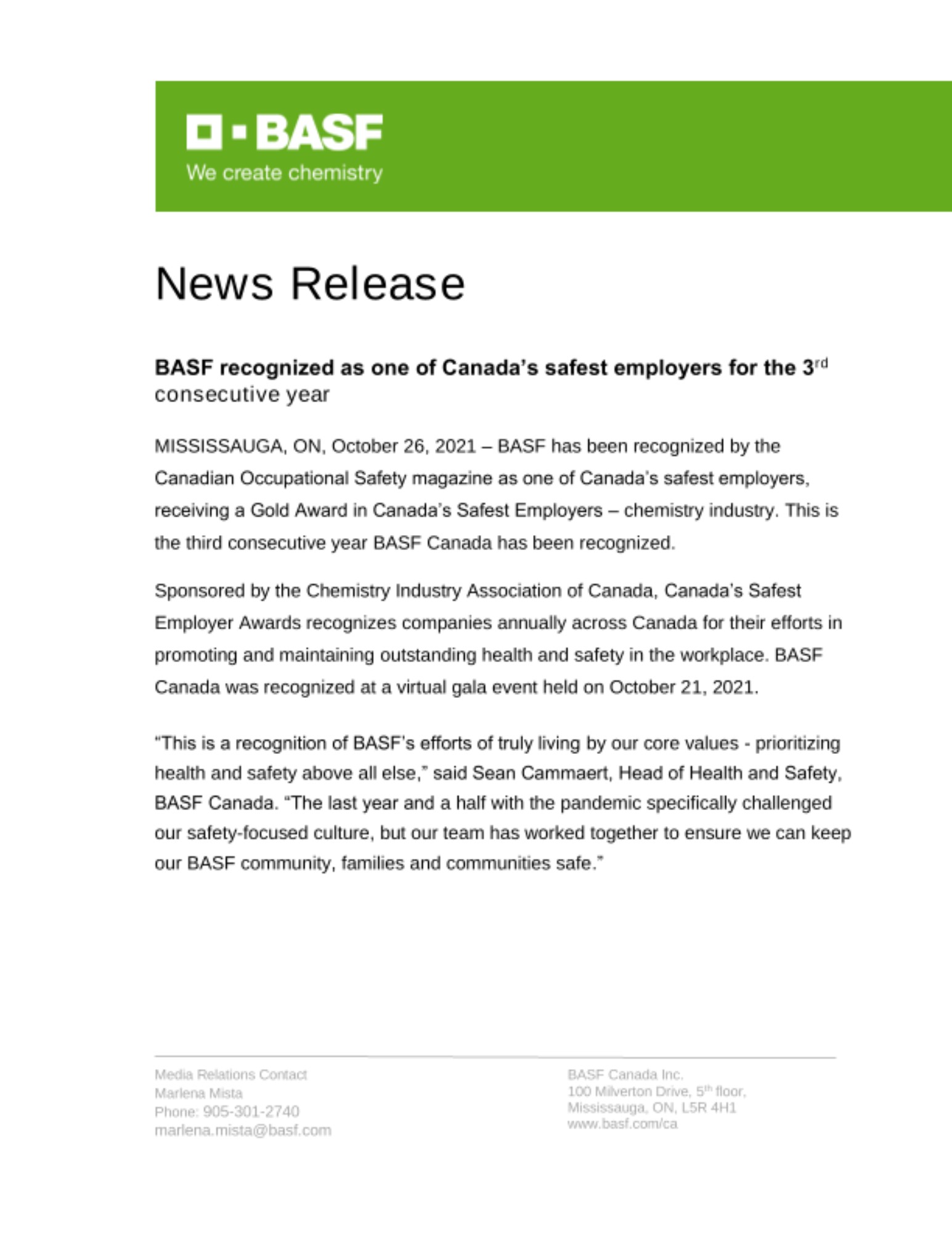 MISSISSAUGA, ON, October 26, 2021 – BASF has been recognized by the Canadian Occupational Safety magazine as one of Canada’s safest employers, receiving a Gold Award in Canada’s Safest Employers – chemistry industry. This is the third consecutive year BASF Canada has been recognized.