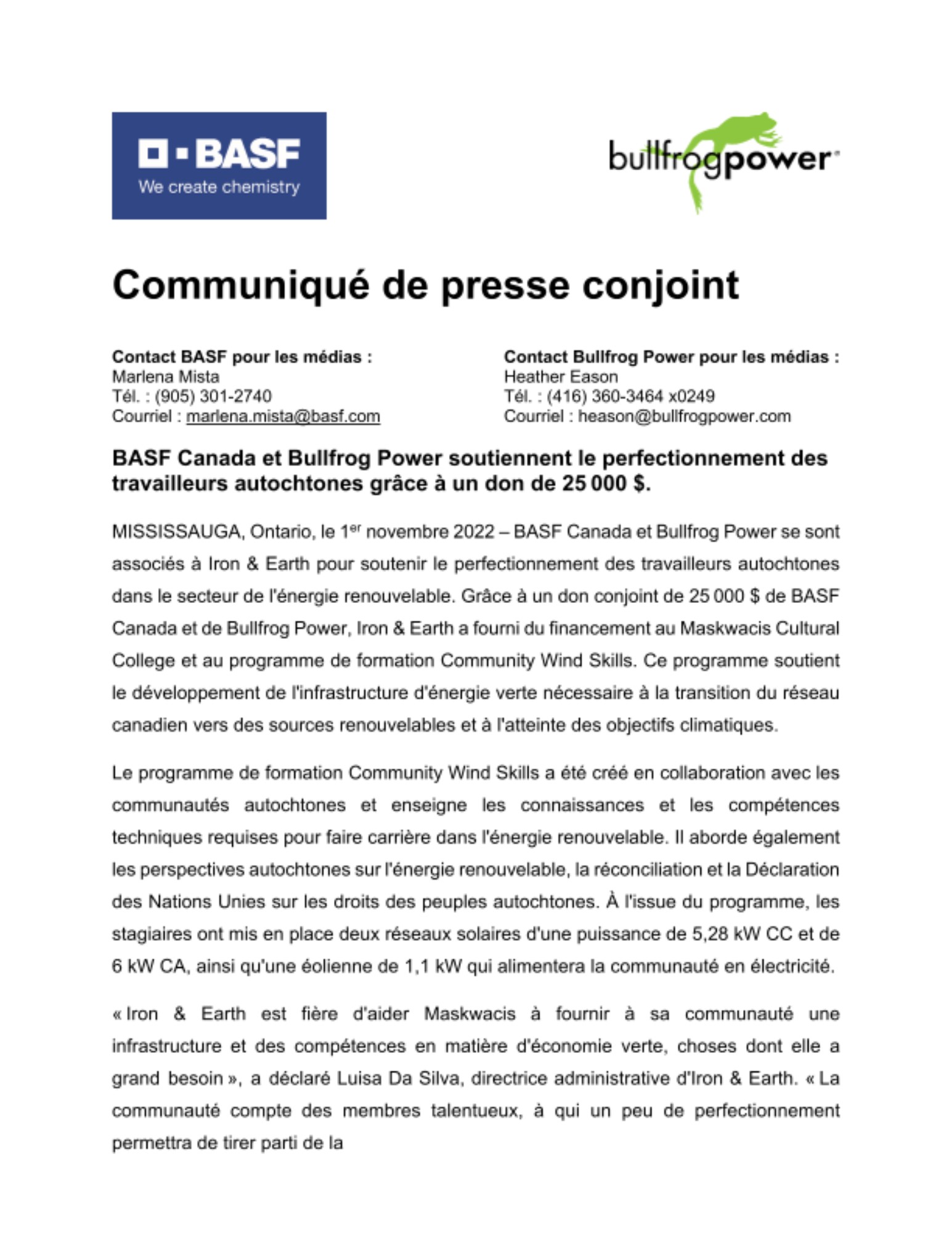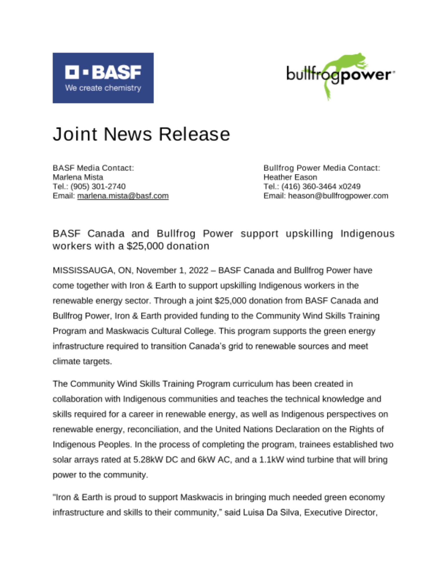 “This is another significant milestone in our partnership with Bullfrog Power, where we support local clean energy programs in communities across the country,” said Eva Musso, Head of Sustainability and Government Relations, BASF Canada. “Together by partnering with Iron & Earth, we can support the Maskwacis community as it transitions to a cleaner future.”