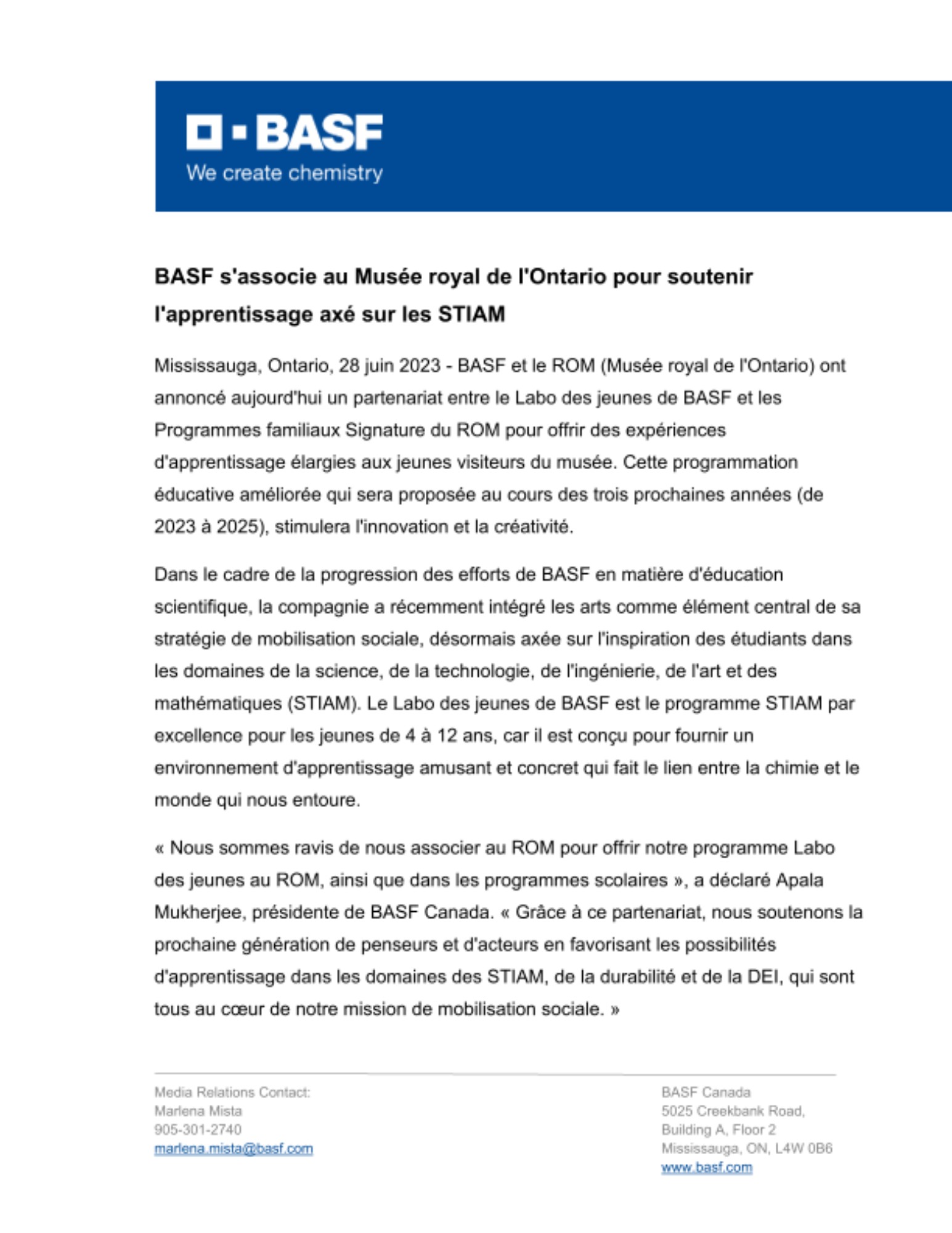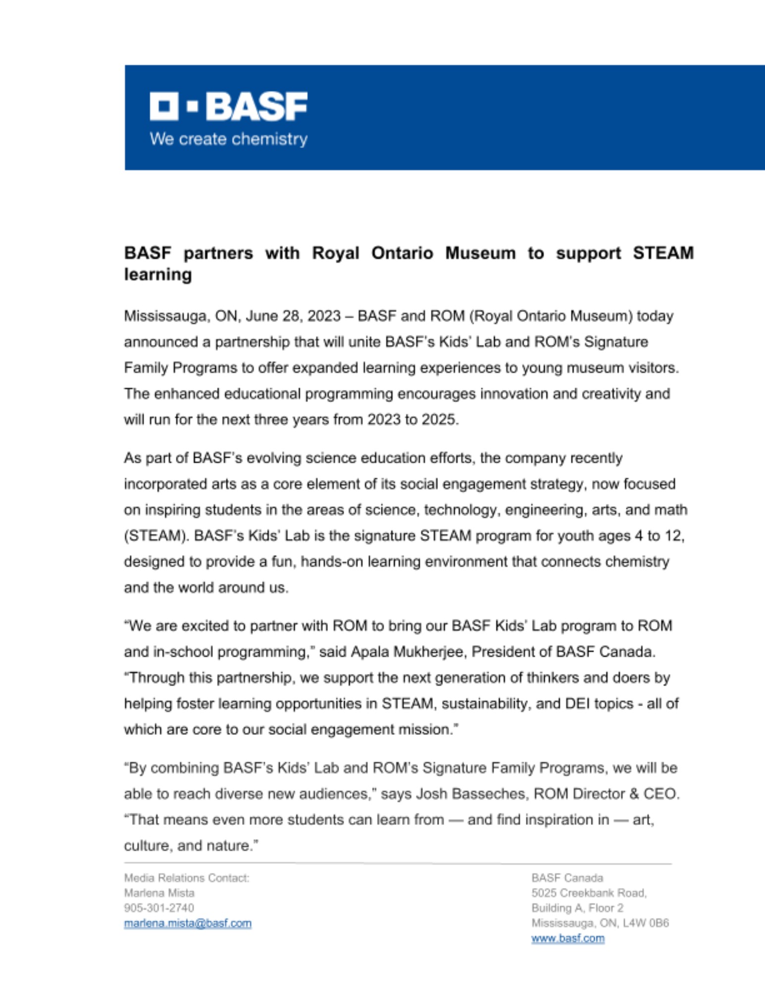 “We are excited to partner with ROM to bring our BASF Kids’ Lab program to ROM and in-school programming,” said Apala Mukherjee, President of BASF Canada. “Through this partnership, we support the next generation of thinkers and doers by helping foster learning opportunities in STEAM, sustainability, and DEI topics - all of which are core to our social engagement mission.”