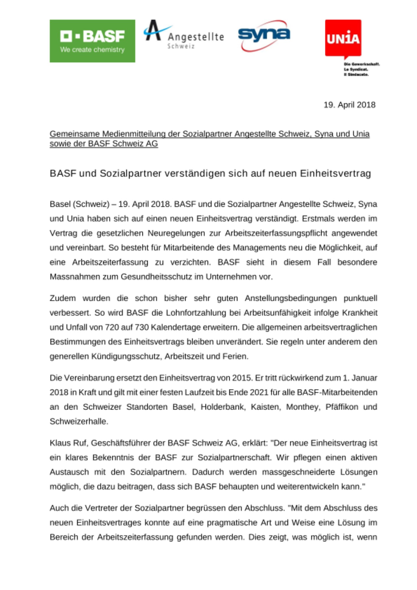 Die Vereinbarung ersetzt den Einheitsvertrag von 2015. Er tritt rückwirkend zum 1. Januar 2018 in Kraft und gilt mit einer festen Laufzeit bis Ende 2021 für alle BASF-Mitarbeitenden an den Schweizer Standorten Basel, Holderbank, Kaisten, Monthey, Pfäffikon und Schweizerhalle.