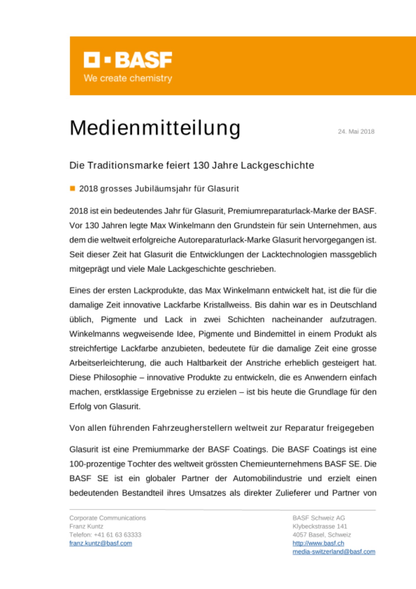 2018 ist ein bedeutendes Jahr für Glasurit, Premiumreparaturlack-Marke der BASF. Vor 130 Jahren legte Max Winkelmann den Grundstein für sein Unternehmen, aus dem die weltweit erfolgreiche Autoreparaturlack-Marke Glasurit hervorgegangen ist. Seit dieser Zeit hat Glasurit die Entwicklungen der Lacktechnologien massgeblich mitgeprägt und viele Male Lackgeschichte geschrieben.