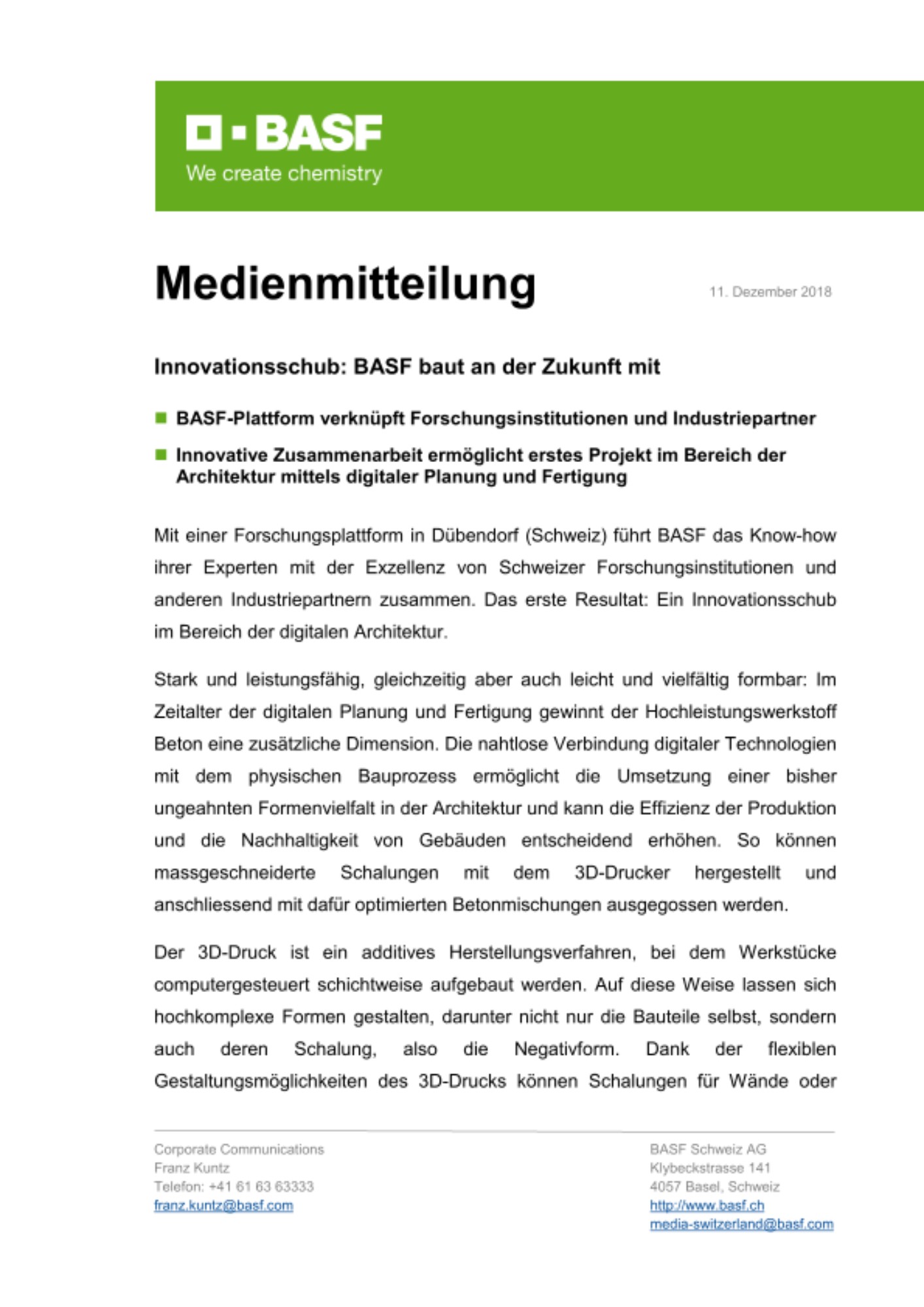 Erste Resultate dieser gemeinsamen Suche nach neuen Lösungen im Bereich der mit 3D-Druck gefertigten Betonschalungen konnte die BASF 3D Printing Solutions zusammen mit Construction Chemicals und BigRep bereits bei der DigitalConcrete 2018 präsentieren, der ersten internationalen Konferenz zum digitalen Bauen mit Beton, die im September 2018 an der ETH Zürich stattfand. BASF und BigRep stellten zudem im NEST auf dem Empa-Campus in Dübendorf Produktmuster und Anwendungsbeispiele vor.