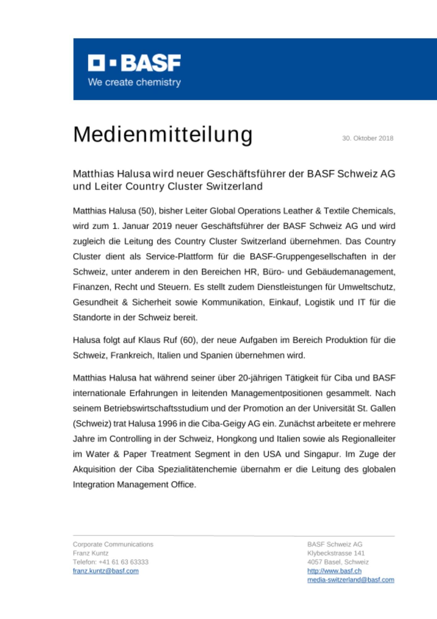 Matthias Halusa (50), bisher Leiter Global Operations Leather & Textile Chemicals, wird zum 1. Januar 2019 neuer Geschäftsführer der BASF Schweiz AG und wird zugleich die Leitung des Country Cluster Switzerland übernehmen. Das Country Cluster dient als Service-Plattform für die BASF-Gruppengesellschaften in der Schweiz, unter anderem in den Bereichen HR, Büro- und Gebäudemanagement, Finanzen, Recht und Steuern. Es stellt zudem Dienstleistungen für Umweltschutz, Gesundheit & Sicherheit sowie Kommunikation, Einkauf, Logistik und IT für die Standorte in der Schweiz bereit.