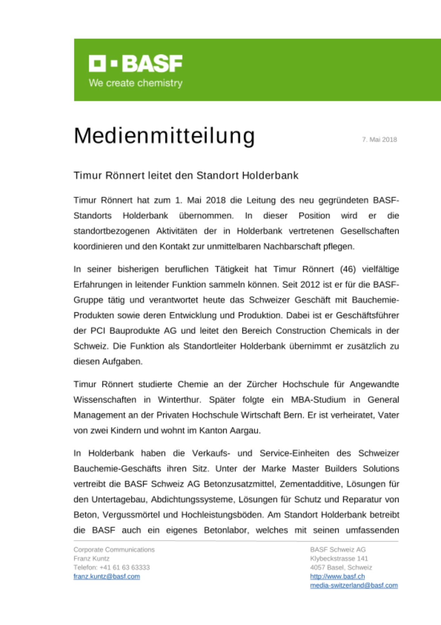 Timur Rönnert hat zum 1. Mai 2018 die Leitung des neu gegründeten BASF-Standorts Holderbank übernommen. In dieser Position wird er die standortbezogenen Aktivitäten der in Holderbank vertretenen Gesellschaften koordinieren und den Kontakt zur unmittelbaren Nachbarschaft pflegen.