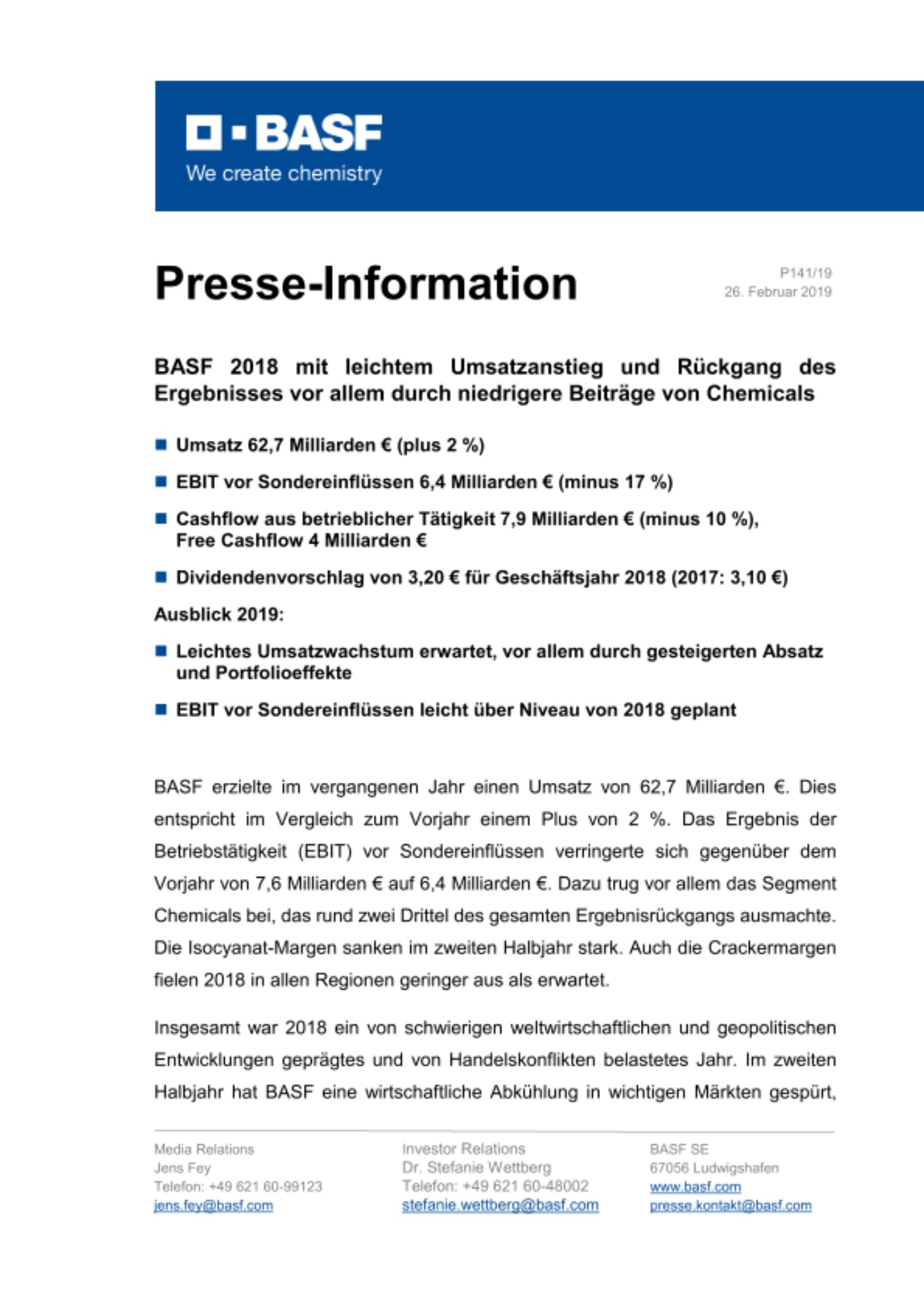 BASF erzielte im vergangenen Jahr einen Umsatz von 62,7 Milliarden €. Dies entspricht im Vergleich zum Vorjahr einem Plus von 2 %. Das Ergebnis der Betriebstätigkeit (EBIT) vor Sondereinflüssen verringerte sich gegenüber dem Vorjahr von 7,6 Milliarden € auf 6,4 Milliarden €. Dazu trug vor allem das Segment Chemicals bei, das rund zwei Drittel des gesamten Ergebnisrückgangs ausmachte. Die Isocyanat-Margen sanken im zweiten Halbjahr stark. Auch die Crackermargen fielen 2018 in allen Regionen geringer aus als erwartet.