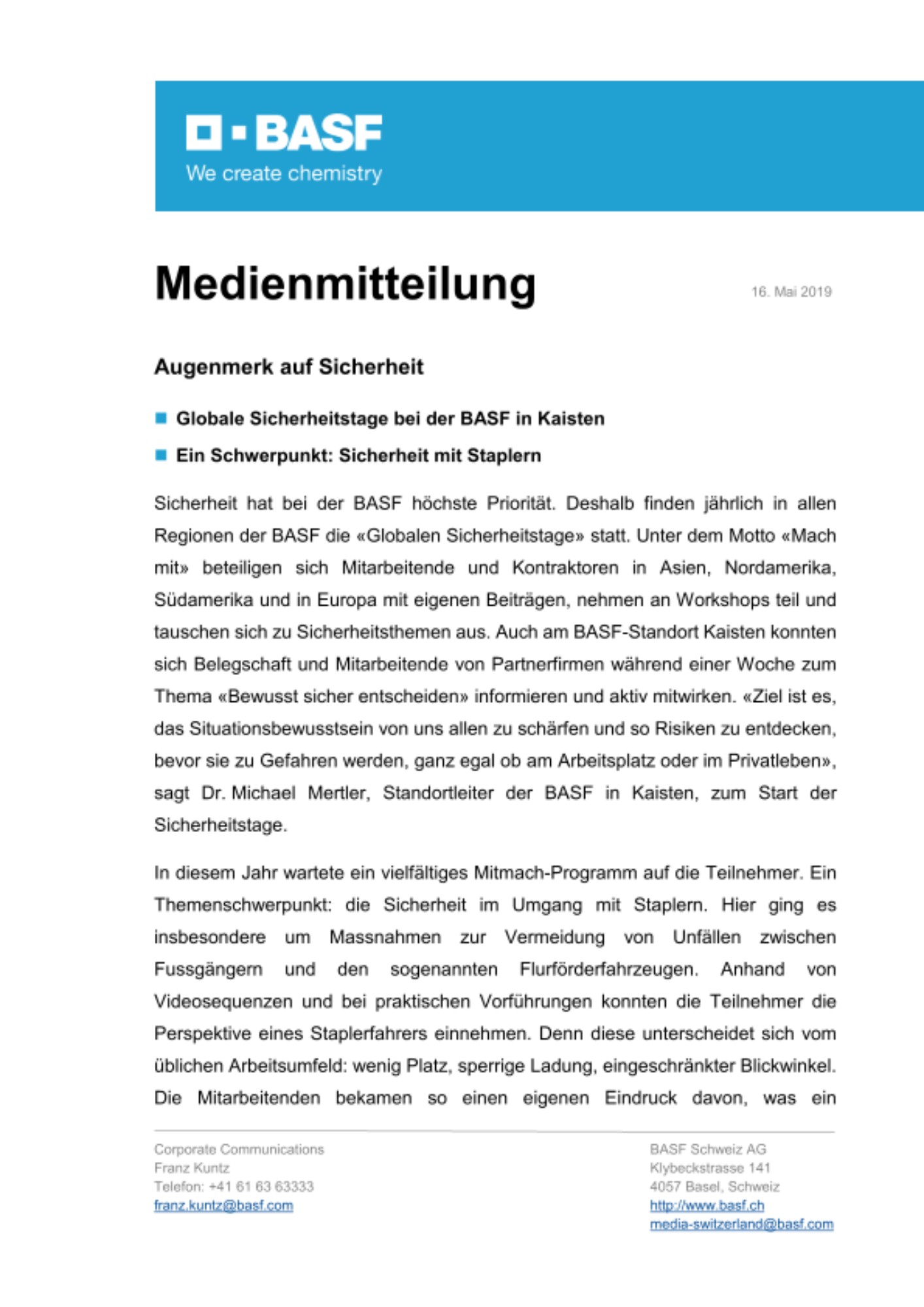 - Globale Sicherheitstage bei der BASF in Kaisten