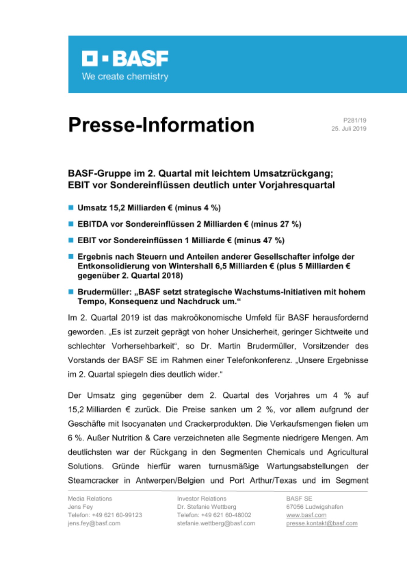 Mit Blick auf das herausfordernde makroökonomische Umfeld hatte BASF am 8. Juli den Ausblick der BASF-Gruppe für 2019 angepasst: BASF erwartet nun einen leichten Rückgang beim Umsatz. Für das EBIT vor Sondereinflüssen erwartet das Unternehmen hingegen einen deutlichen Rückgang von bis zu 30 %. Beim Return On Capital Employed (ROCE) wird für das Gesamtjahr 2019 ein deutlicher Rückgang im Vergleich zum Vorjahr erwartet.