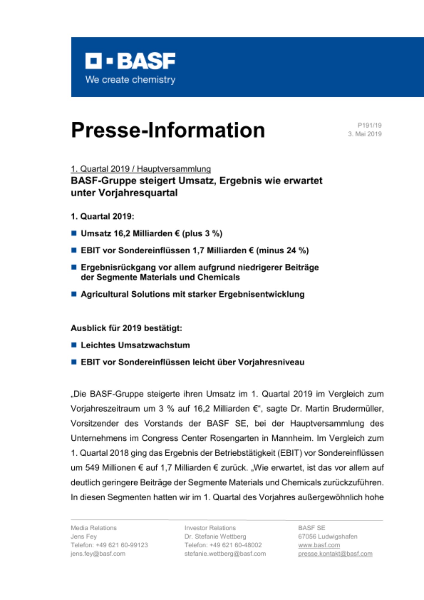 «Die BASF-Gruppe steigerte ihren Umsatz im 1. Quartal 2019 im Vergleich zum Vorjahreszeitraum um 3 % auf 16,2 Milliarden €», sagte Dr. Martin Brudermüller, Vorsitzender des Vorstands der BASF SE, bei der Hauptversammlung des Unternehmens im Congress Center Rosengarten in Mannheim. Im Vergleich zum 1. Quartal 2018 ging das Ergebnis der Betriebstätigkeit (EBIT) vor Sondereinflüssen um 549 Millionen € auf 1,7 Milliarden € zurück. «Wie erwartet, ist das vor allem auf deutlich geringere Beiträge der Segmente Materials und Chemicals zurückzuführen. In diesen Segmenten hatten wir im 1. Quartal des Vorjahres aussergewöhnlich hohe Isocyanate- und starke Crackermargen verzeichnet», so Brudermüller. Auch bei Sonstige und Nutrition & Care sank das EBIT vor Sondereinflüssen deutlich, während es im Segment Surface Technologies auf dem Niveau des Vorjahresquartals blieb. Agricultural Solutions sowie Industrial Solutions verzeichneten hingegen ein deutlich verbessertes Ergebnis.