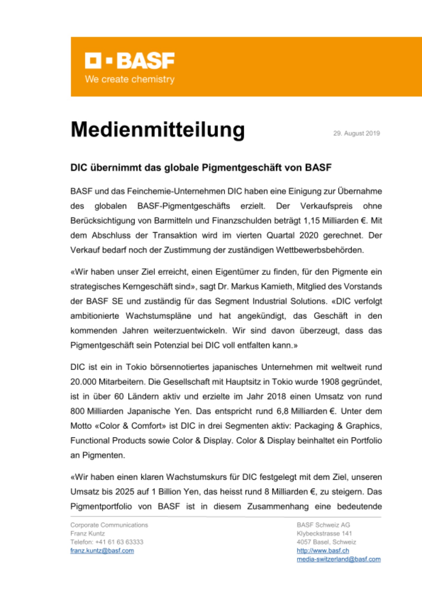 Für Dr. Alexander Haunschild, Senior Vice President und Managing Director der im Pigmentgeschäft tätigen BASF-Tochtergesellschaft BASF Colors & Effects ist die erzielte Einigung eine Chance, den seit 2016 eingeschlagenen Wachstumskurs fortzuführen: «Wir sehen in DIC einen Eigentümer, der bereit ist, in dieses Geschäft zu investieren, sich zu Innovationen bekennt und an einem längerfristigen Erfolg des Pigmentgeschäfts interessiert ist.»