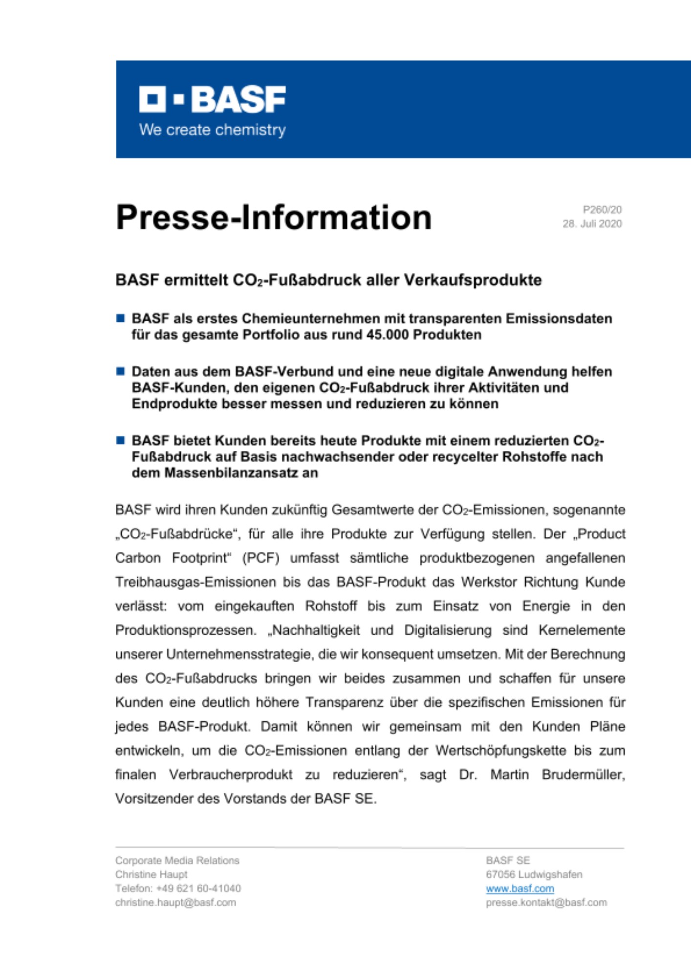 BASF wird ihren Kunden zukünftig Gesamtwerte der CO2-Emissionen, sogenannte „CO2-Fussabdrücke“, für alle ihre Produkte zur Verfügung stellen. Der „Product Carbon Footprint“ (PCF) umfasst sämtliche produktbezogenen angefallenen Treibhausgas-Emissionen bis das BASF-Produkt das Werkstor Richtung Kunde verlässt: vom eingekauften Rohstoff bis zum Einsatz von Energie in den Produktionsprozessen. „Nachhaltigkeit und Digitalisierung sind Kernelemente unserer Unternehmensstrategie, die wir konsequent umsetzen. Mit der Berechnung des CO2-Fussabdrucks bringen wir beides zusammen und schaffen für unsere Kunden eine deutlich höhere Transparenz über die spezifischen Emissionen für jedes BASF-Produkt. Damit können wir gemeinsam mit den Kunden Pläne entwickeln, um die CO2-Emissionen entlang der Wertschöpfungskette bis zum finalen Verbraucherprodukt zu reduzieren“, sagt Dr. Martin Brudermüller, Vorsitzender des Vorstands der BASF SE.
