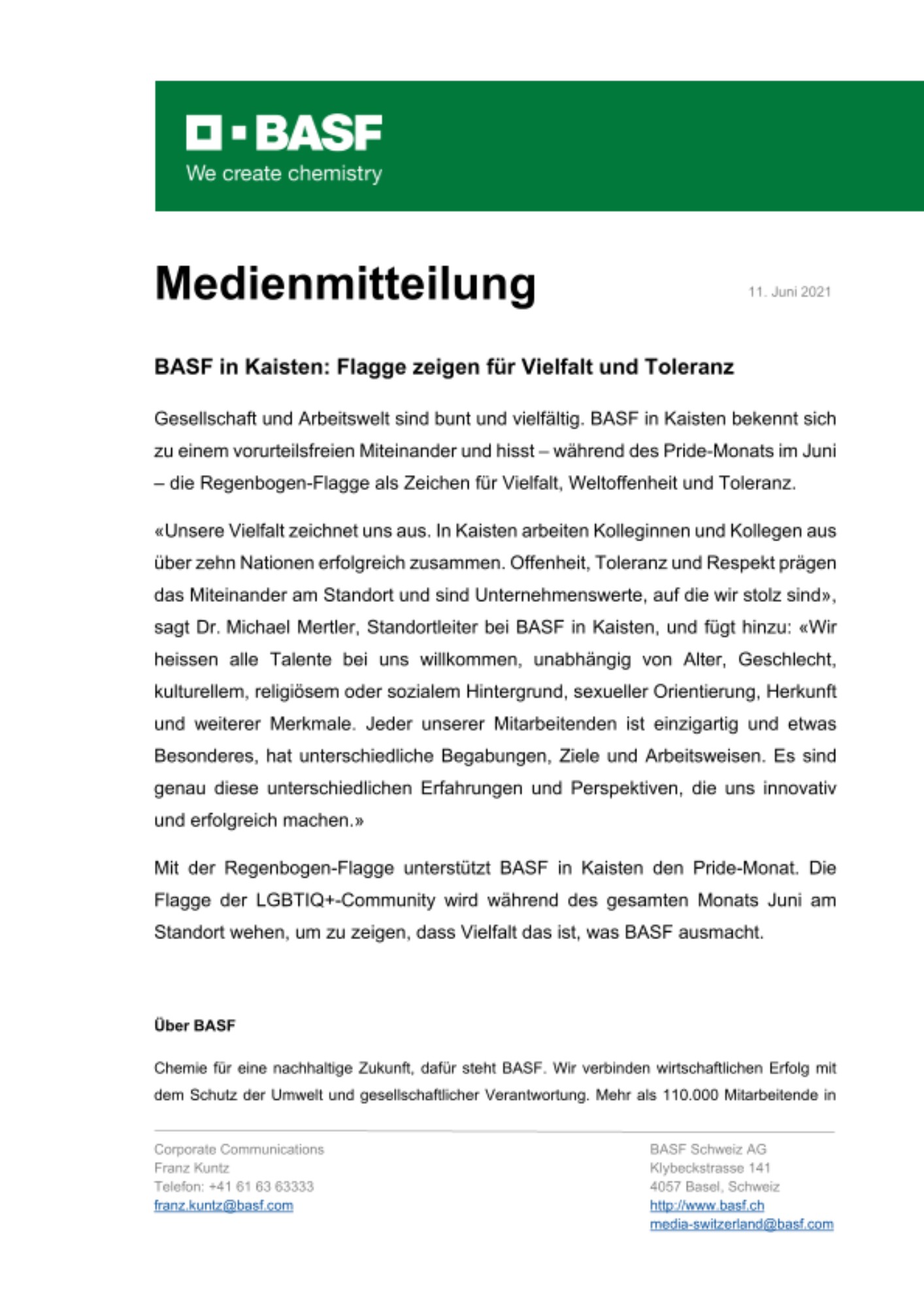 «Unsere Vielfalt zeichnet uns aus. In Kaisten arbeiten Kolleginnen und Kollegen aus über zehn Nationen erfolgreich zusammen. Offenheit, Toleranz und Respekt prägen das Miteinander am Standort und sind Unternehmenswerte, auf die wir stolz sind», sagt Dr. Michael Mertler, Standortleiter bei BASF in Kaisten, und fügt hinzu: «Wir heissen alle Talente bei uns willkommen, unabhängig von Alter, Geschlecht, kulturellem, religiösem oder sozialem Hintergrund, sexueller Orientierung, Herkunft und weiterer Merkmale. Jeder unserer Mitarbeitenden ist einzigartig und etwas Besonderes, hat unterschiedliche Begabungen, Ziele und Arbeitsweisen. Es sind genau diese unterschiedlichen Erfahrungen und Perspektiven, die uns innovativ und erfolgreich machen.»