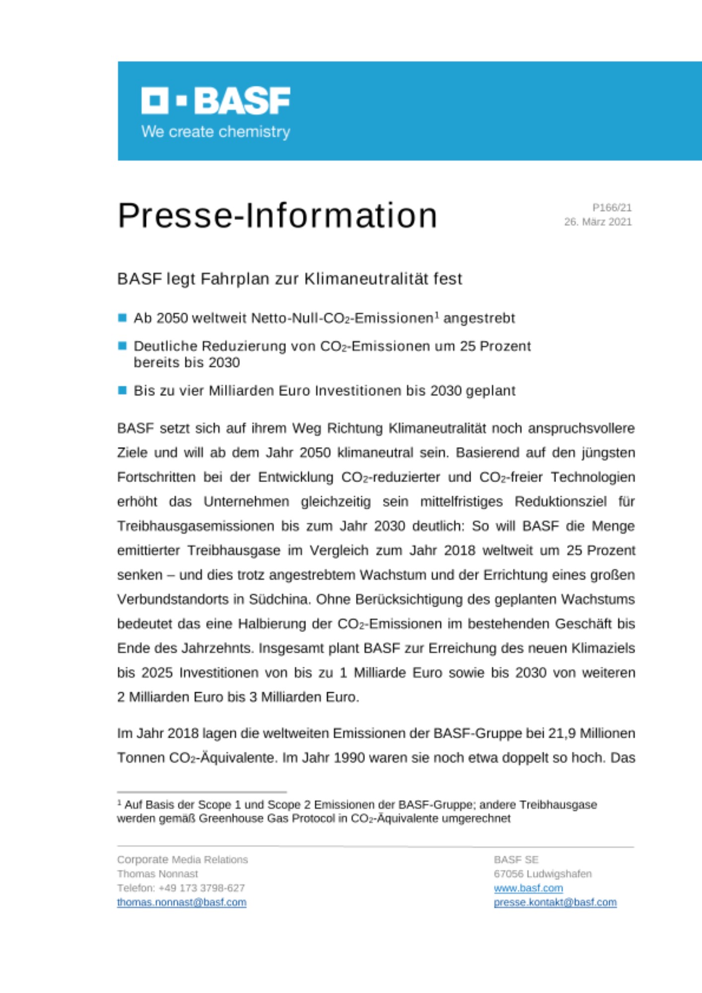 Im Jahr 2018 lagen die weltweiten Emissionen der BASF-Gruppe bei 21,9 Millionen Tonnen CO2-Äquivalente. Im Jahr 1990 waren sie noch etwa doppelt so hoch. Das neue Emissionsziel 2030 entspricht einer Reduktion von rund 60 Prozent im Vergleich zu 1990 und wird das Ziel der Europäischen Union von minus 55 Prozent übertreffen. «Die neuen Klimaziele unterstreichen unsere Entschlossenheit und das Bekenntnis der BASF zum Pariser Klimaabkommen. Der Klimawandel ist die grösste Herausforderung des 21. Jahrhunderts. Darauf müssen wir unsere Prozesse und unser Produktportfolio ausrichten. Daher müssen wir diesen Umbau jetzt forcieren. Dabei kommt es zunächst auf die ersten Meter der Wegstrecke an und nicht auf die letzten. Deshalb werden wir bei BASF verstärkt auf den Einsatz erneuerbarer Energien setzen, und wir beschleunigen die Entwicklung und den Einsatz neuer CO2-freier Verfahren für die Herstellung von Chemikalien. Mit Transparenz und Angeboten zur gezielten schrittweisen Reduktion des CO2-Fussabdrucks von BASF-Produkten entlang der gesamten Wertschöpfungskette unterstützen wir unsere Kunden in allen Industrien, den CO2-Fussabdruck ihrer eigenen Produkte zu reduzieren», sagt Dr. Martin Brudermüller, Vorsitzender des Vorstands der BASF SE.