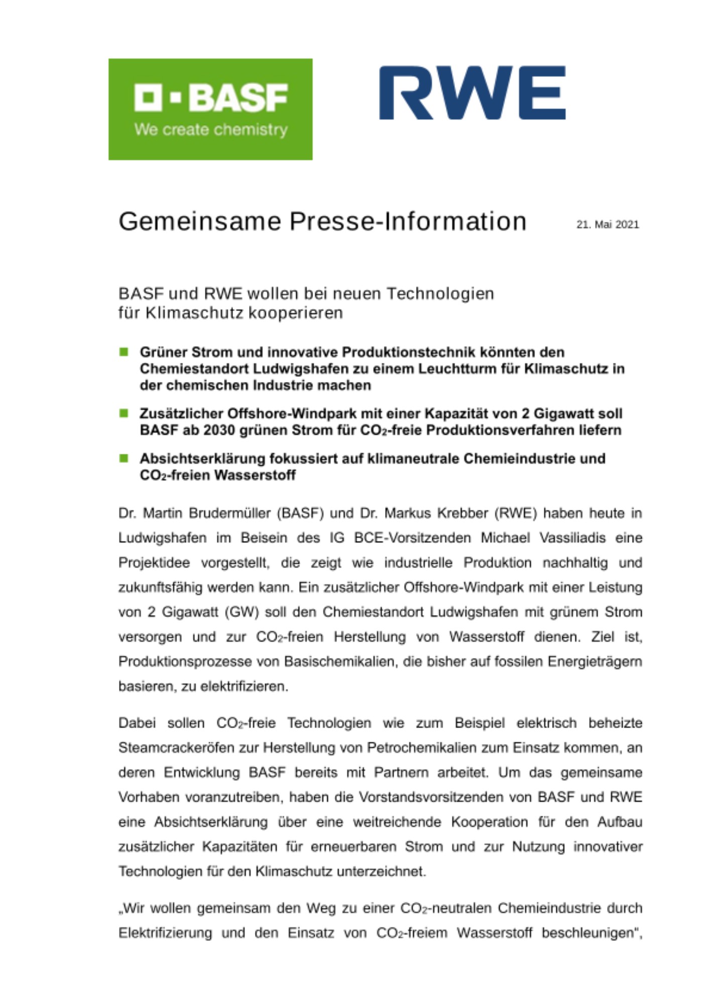 Dabei sollen CO2-freie Technologien wie zum Beispiel elektrisch beheizte Steamcrackeröfen zur Herstellung von Petrochemikalien zum Einsatz kommen, an deren Entwicklung BASF bereits mit Partnern arbeitet. Um das gemeinsame Vorhaben voranzutreiben, haben die Vorstandsvorsitzenden von BASF und RWE eine Absichtserklärung über eine weitreichende Kooperation für den Aufbau zusätzlicher Kapazitäten für erneuerbaren Strom und zur Nutzung innovativer Technologien für den Klimaschutz unterzeichnet.