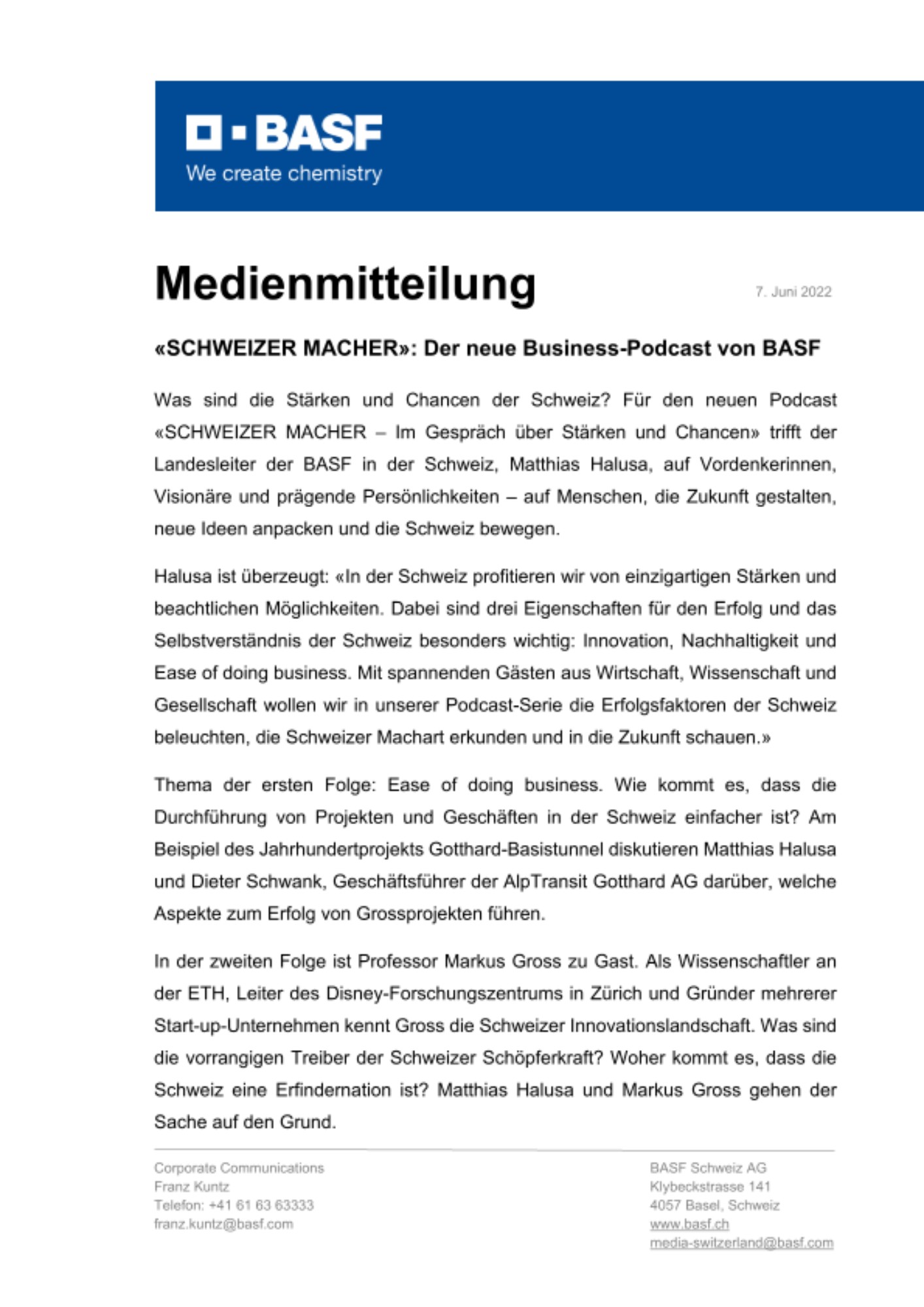 «SCHWEIZER MACHER»: Der neue Business-Podcast von BASF