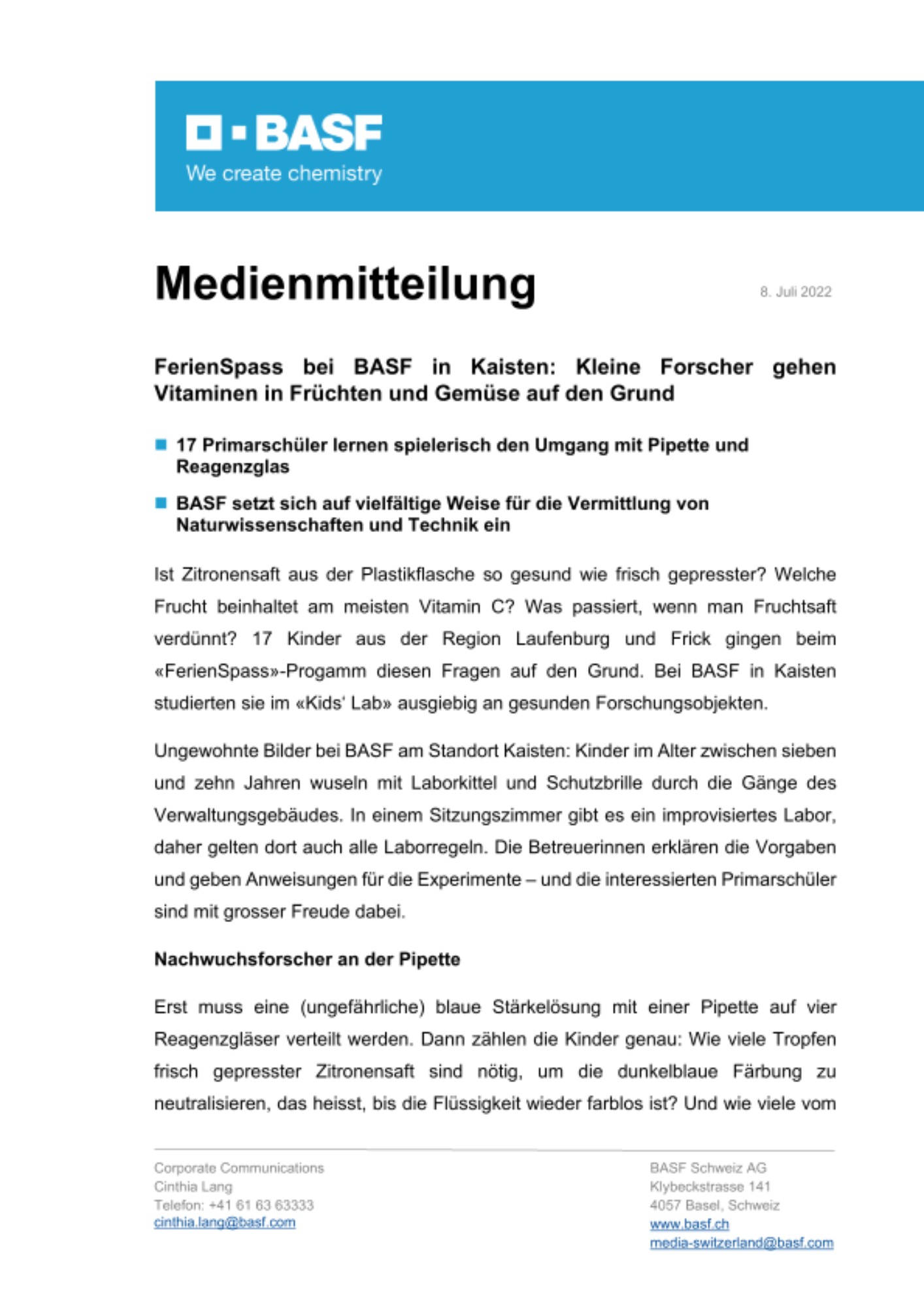 BASF setzt sich auf vielfältige Weise dafür ein, Kindern, Jugendlichen und Erwachsenen Lust auf Naturwissenschaften und Technik zu vermitteln. Ein weiteres Angebot, spannende Experimente für Gross und Klein zu entdecken, ist das «Virtual Lab» auf der Internetseite von BASF in der Schweiz: http://www.basf.ch/virtual_lab.