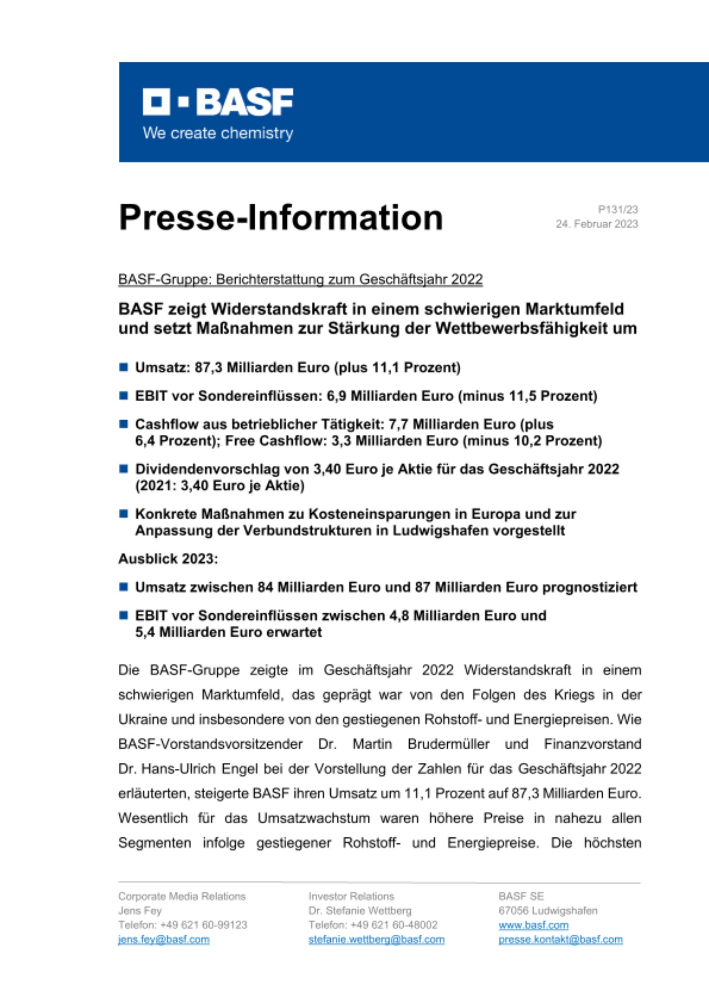 Vorstand und Aufsichtsrat werden der diesjährigen BASF-Hauptversammlung eine Dividende auf Höhe des Vorjahres von 3,40 Euro je Aktie vorschlagen. Bezogen auf den Jahresschlusskurs ergibt sich daraus eine hohe Dividendenrendite von 7,3 Prozent. Insgesamt wird BASF 3,0 Milliarden Euro an ihre Aktionärinnen und Aktionäre ausschütten.