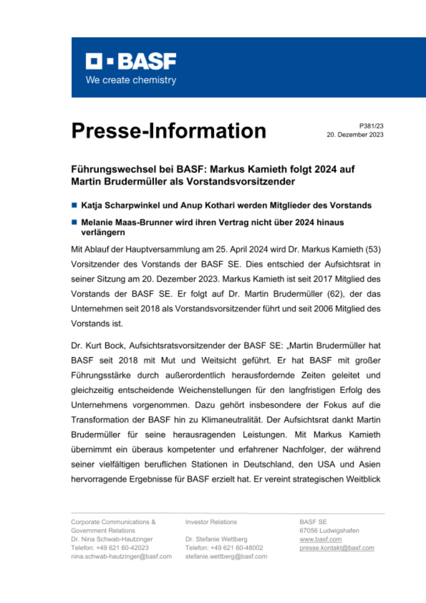 Mit Ablauf der Hauptversammlung am 25. April 2024 wird Dr. Markus Kamieth (53) Vorsitzender des Vorstands der BASF SE. Dies entschied der Aufsichtsrat in seiner Sitzung am 20. Dezember 2023. Markus Kamieth ist seit 2017 Mitglied des Vorstands der BASF SE. Er folgt auf Dr. Martin Brudermüller (62), der das Unternehmen seit 2018 als Vorstandsvorsitzender führt und seit 2006 Mitglied des Vorstands ist.