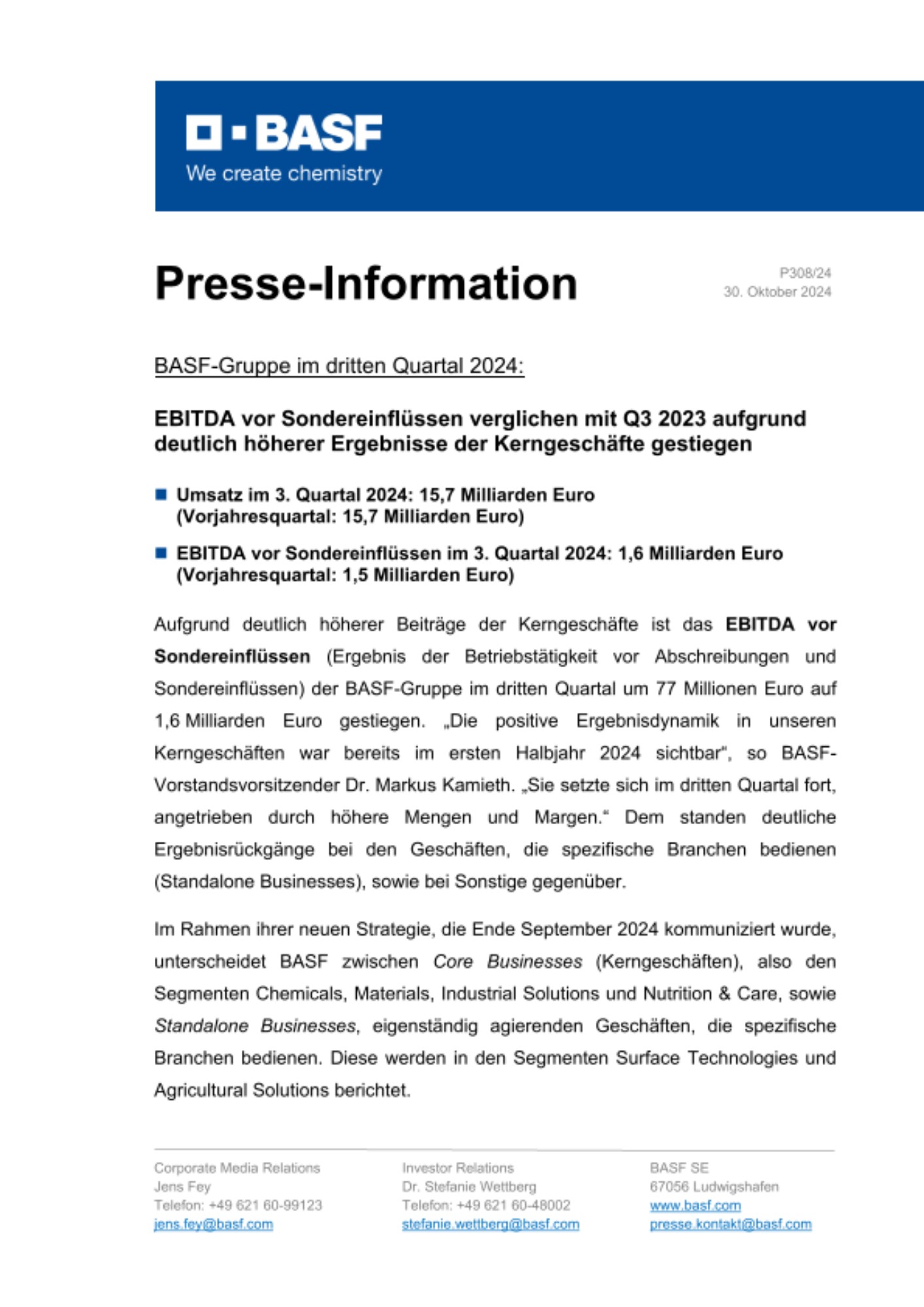 Aufgrund deutlich höherer Beiträge der Kerngeschäfte ist das EBITDA vor Sondereinflüssen (Ergebnis der Betriebstätigkeit vor Abschreibungen und Sondereinflüssen) der BASF-Gruppe im dritten Quartal um 77 Millionen Euro auf 1,6 Milliarden Euro gestiegen. «Die positive Ergebnisdynamik in unseren Kerngeschäften war bereits im ersten Halbjahr 2024 sichtbar», so BASF-Vorstandsvorsitzender Dr. Markus Kamieth. «Sie setzte sich im dritten Quartal fort, angetrieben durch höhere Mengen und Margen.» Dem standen deutliche Ergebnisrückgänge bei den Geschäften, die spezifische Branchen bedienen (Standalone Businesses), sowie bei Sonstige gegenüber.