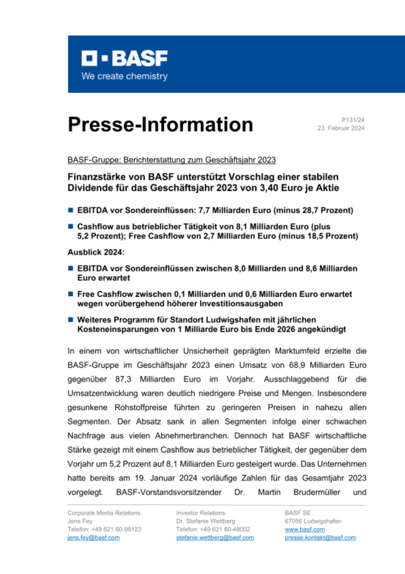 Finanzstärke von BASF unterstützt Vorschlag einer stabilen Dividende für das Geschäftsjahr 2023 von 3,40 Euro je Aktie