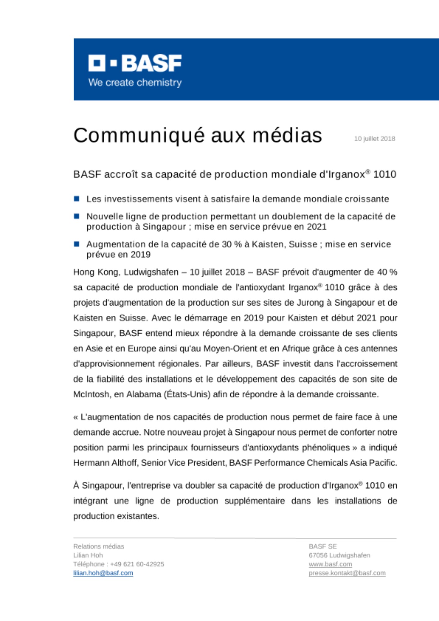 BASF prévoit d'augmenter de 40 % sa capacité de production mondiale de l'antioxydant Irganox® 1010 grâce à des projets d'augmentation de la production sur ses sites de Jurong à Singapour et de Kaisten en Suisse. Avec le démarrage en 2019 pour Kaisten et début 2021 pour Singapour, BASF entend mieux répondre à la demande croissante de ses clients en Asie et en Europe ainsi qu'au Moyen-Orient et en Afrique grâce à ces antennes d'approvisionnement régionales. Par ailleurs, BASF investit dans l'accroissement de la fiabilité des installations et le développement des capacités de son site de McIntosh, en Alabama (États-Unis) afin de répondre à la demande croissante.