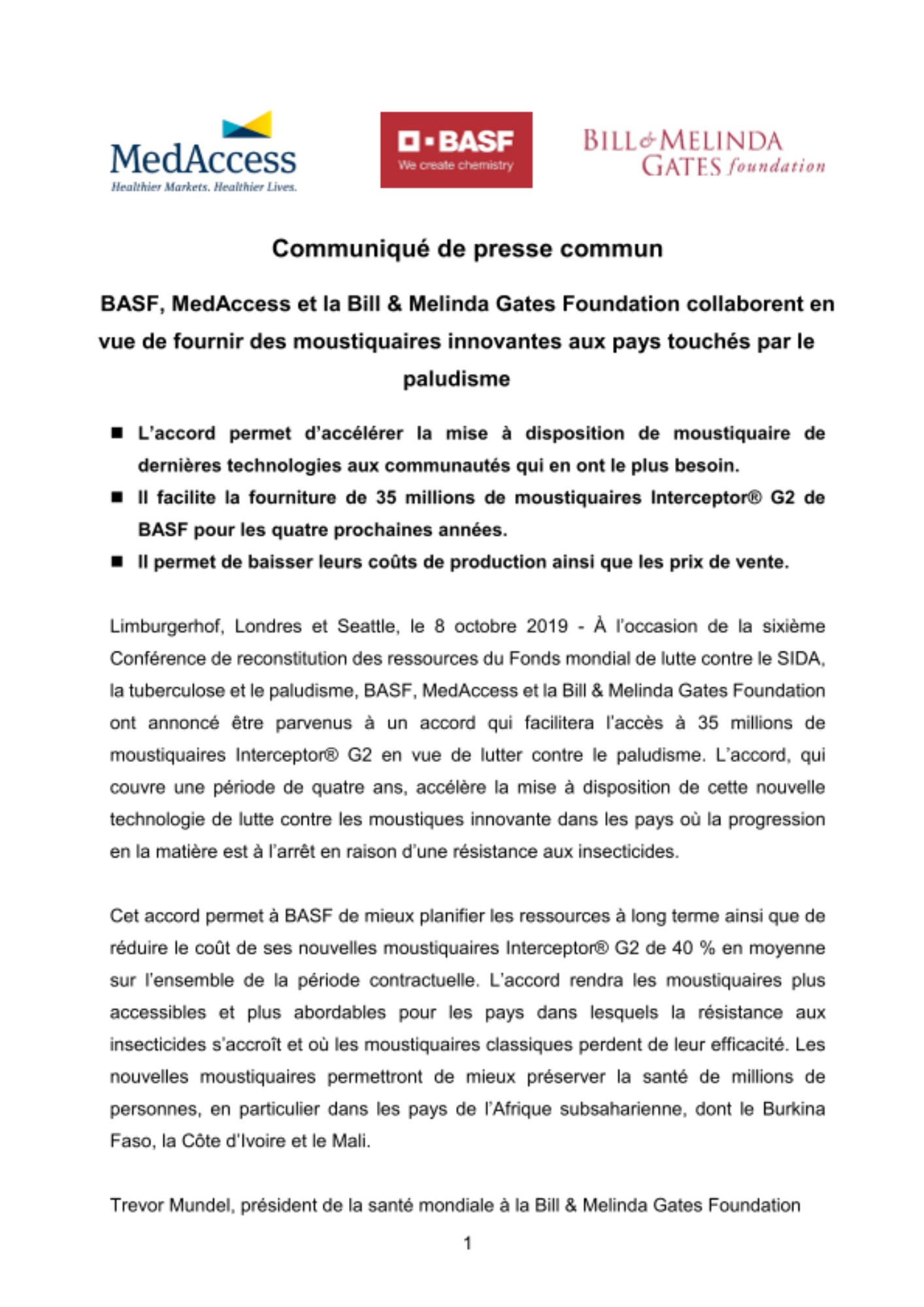 Limburgerhof, Londres et Seattle, le 8 octobre 2019 - À l’occasion de la sixième Conférence de reconstitution des ressources du Fonds mondial de lutte contre le SIDA, la tuberculose et le paludisme, BASF, MedAccess et la Bill & Melinda Gates Foundation ont annoncé être parvenus à un accord qui facilitera l’accès à 35 millions de moustiquaires Interceptor® G2 en vue de lutter contre le paludisme. L’accord, qui couvre une période de quatre ans, accélère la mise à disposition de cette nouvelle technologie de lutte contre les moustiques innovante dans les pays où la progression en la matière est à l’arrêt en raison d’une résistance aux insecticides.