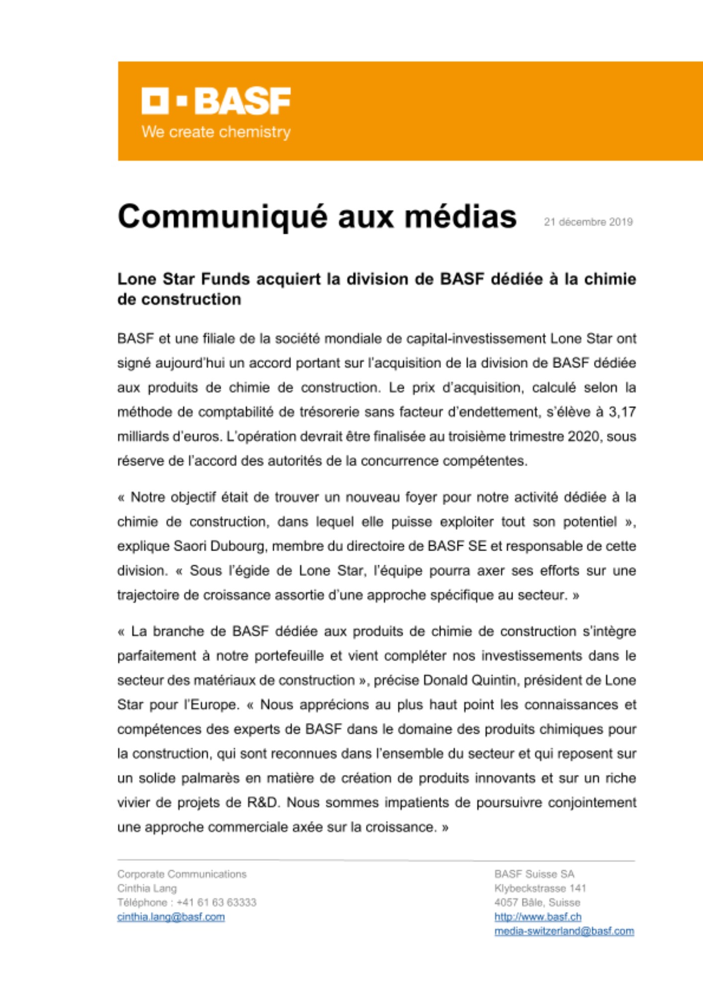 BASF et une filiale de la société mondiale de capital-investissement Lone Star ont signé aujourd’hui un accord portant sur l’acquisition de la division de BASF dédiée aux produits de chimie de construction. Le prix d’acquisition, calculé selon la méthode de comptabilité de trésorerie sans facteur d’endettement, s’élève à 3,17 milliards d’euros. L’opération devrait être finalisée au troisième trimestre 2020, sous réserve de l’accord des autorités de la concurrence compétentes.